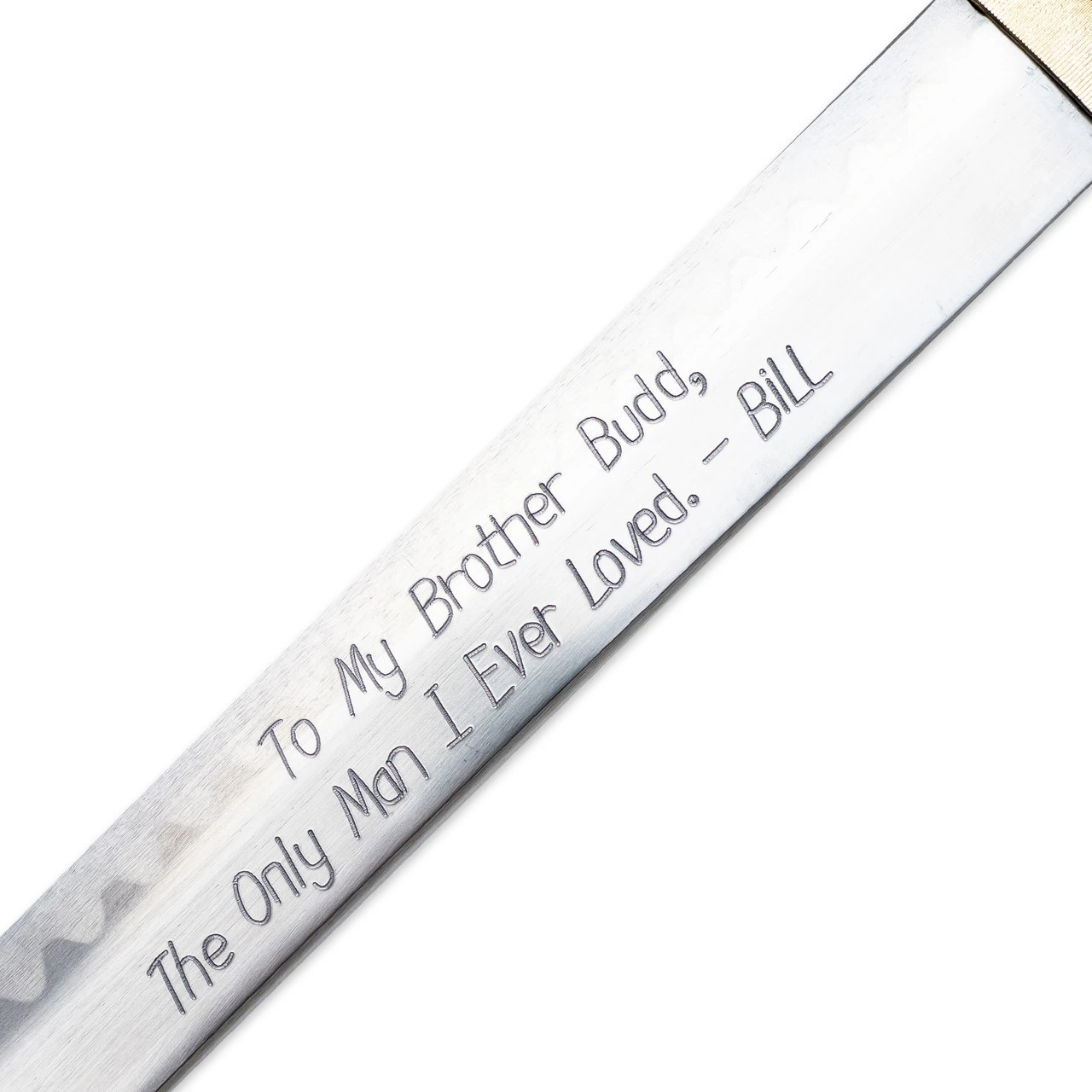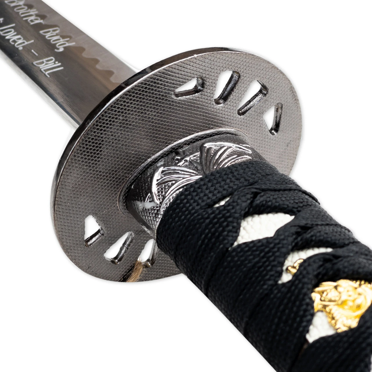 Hand forged steel from a prodigious sword producer. This samurai sword is a genuine masterpiece of the Bride sword from the movie Kill Bill. It is hand forged to meet the strictest standards. Each sword has its own hand hammered pattern and is individually hand sharpened. It has a thick 7.45mm blade that separates (slices) targets like butter. Careful, it is very sharp and can be dangerous in untrained hands. Etched into the forged blade is the Hattori Hanzo “foo-dog” insignia. The sword guard is made of solid metal with brass trim. Grip the handle with confidence, as the cotton wrapped grip is securely functional. The hardwood scabbard is gloss black with a clear Urethane coating, also known as piano finish. It features the Hanzo engraving and precise designing. This sharp masterpiece can be displayed with the included stand or used for cutting.