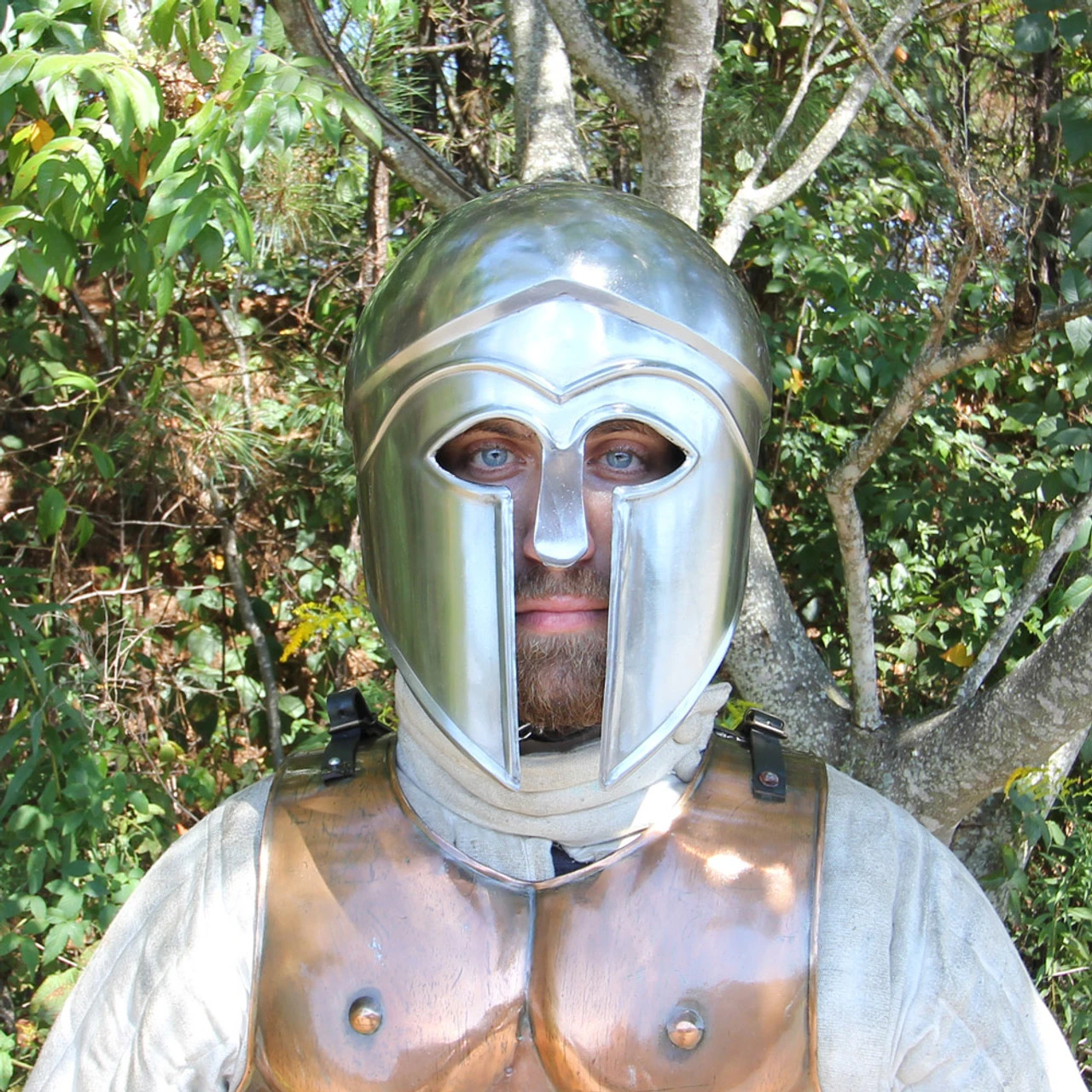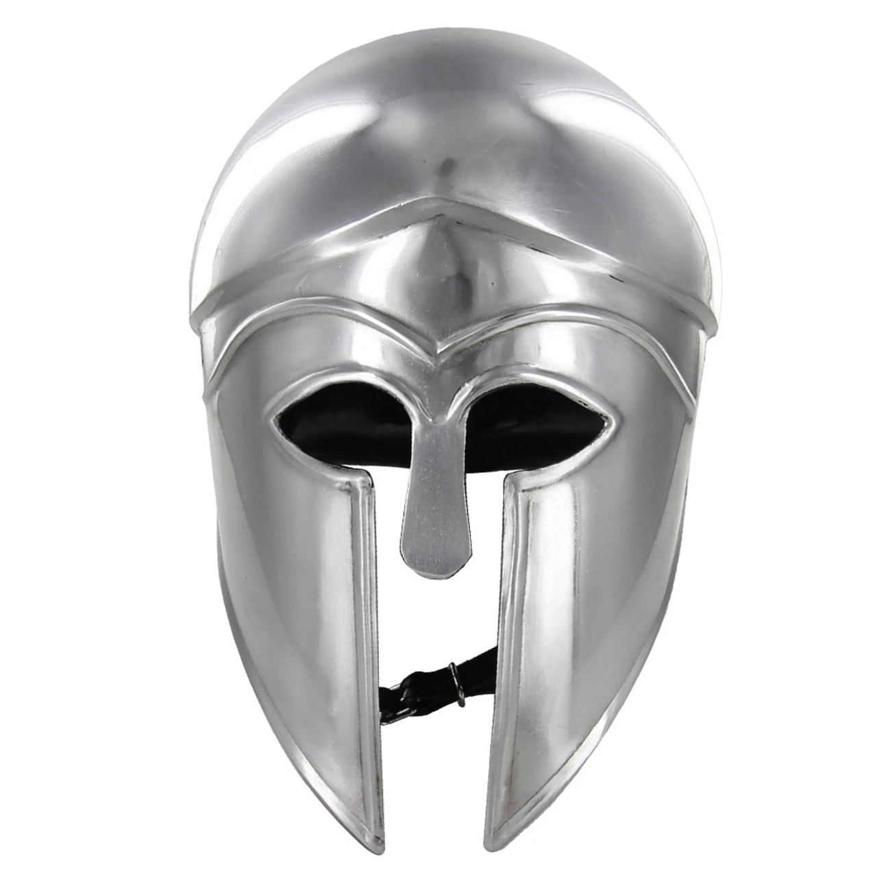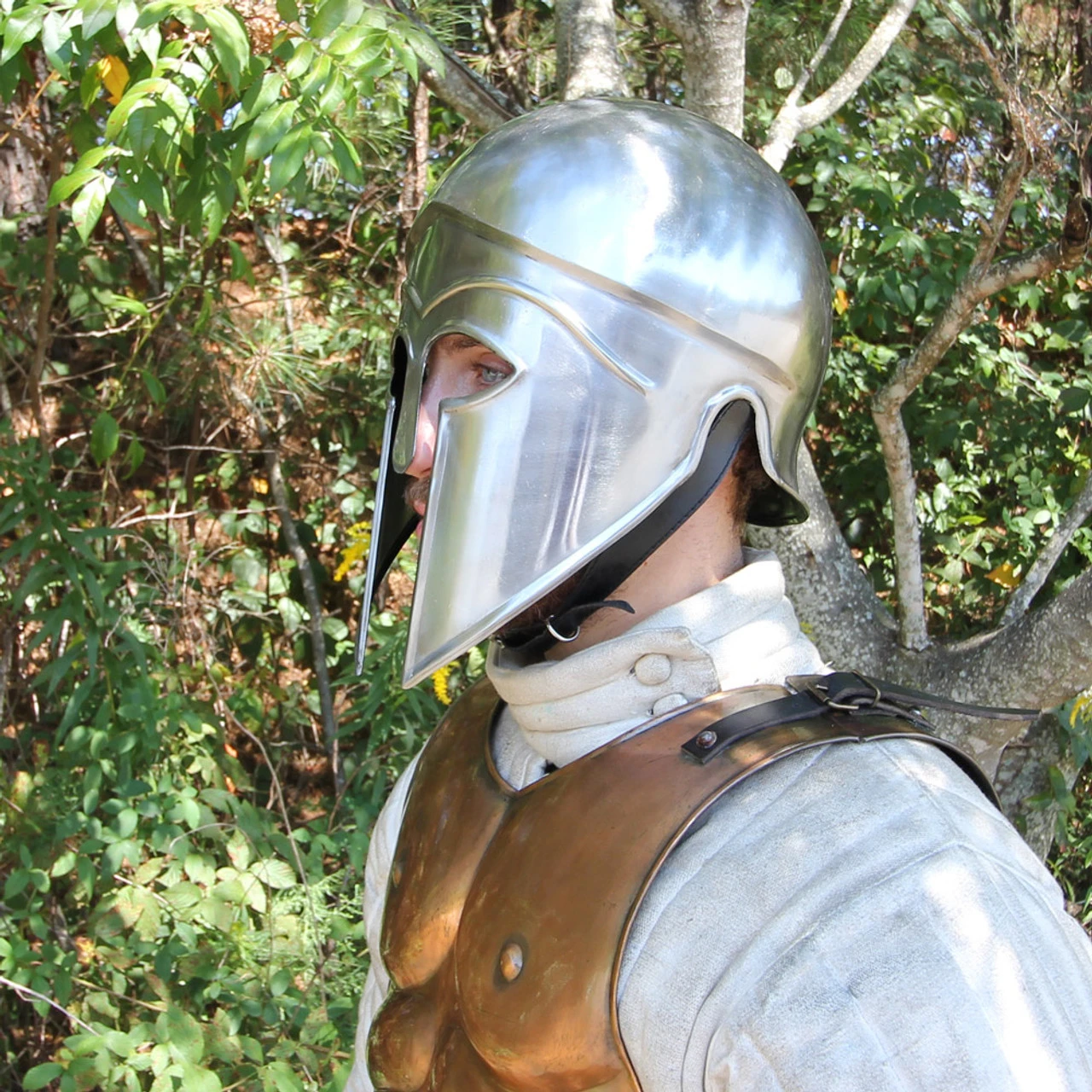 This Corinthian style of helmet would have been worn by Greek hoplites during battle in 500 BC. Besides offering protection, the main feature of these helmets was the impressive work of the smith to beat out the entire helmet from one sheet of metal. The design has a T shape for the eyes and mouth with a nose-guard. The impeccable detailing while simple gives this piece that something extra. The sides have cutouts for the ears making it easier to hear commands while in phalanx formation. A soft leather suspension liner with an adjustable strap and buckle is featured inside for comfort. This helmet safe guards the top of the head, cheeks and neck. Constructed of 20 gauge steel and polished up nicely this helmet will put the finishing touch on any period or re-enactment costume.