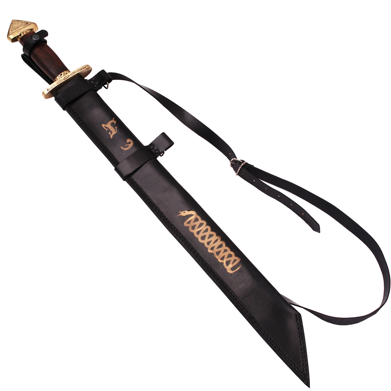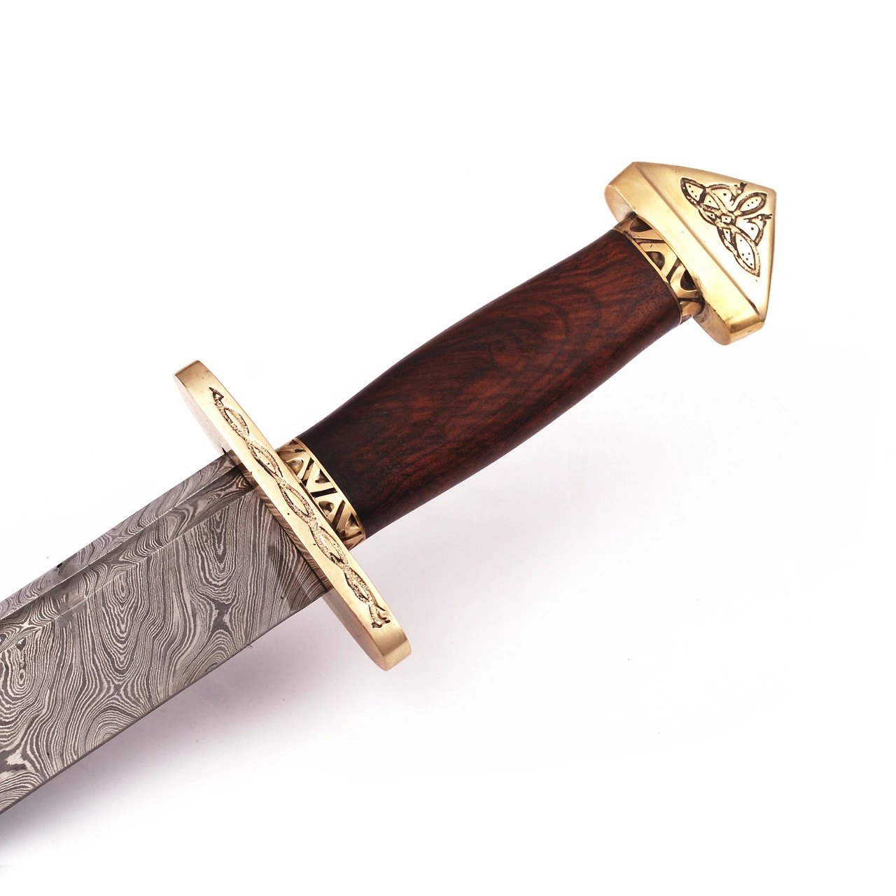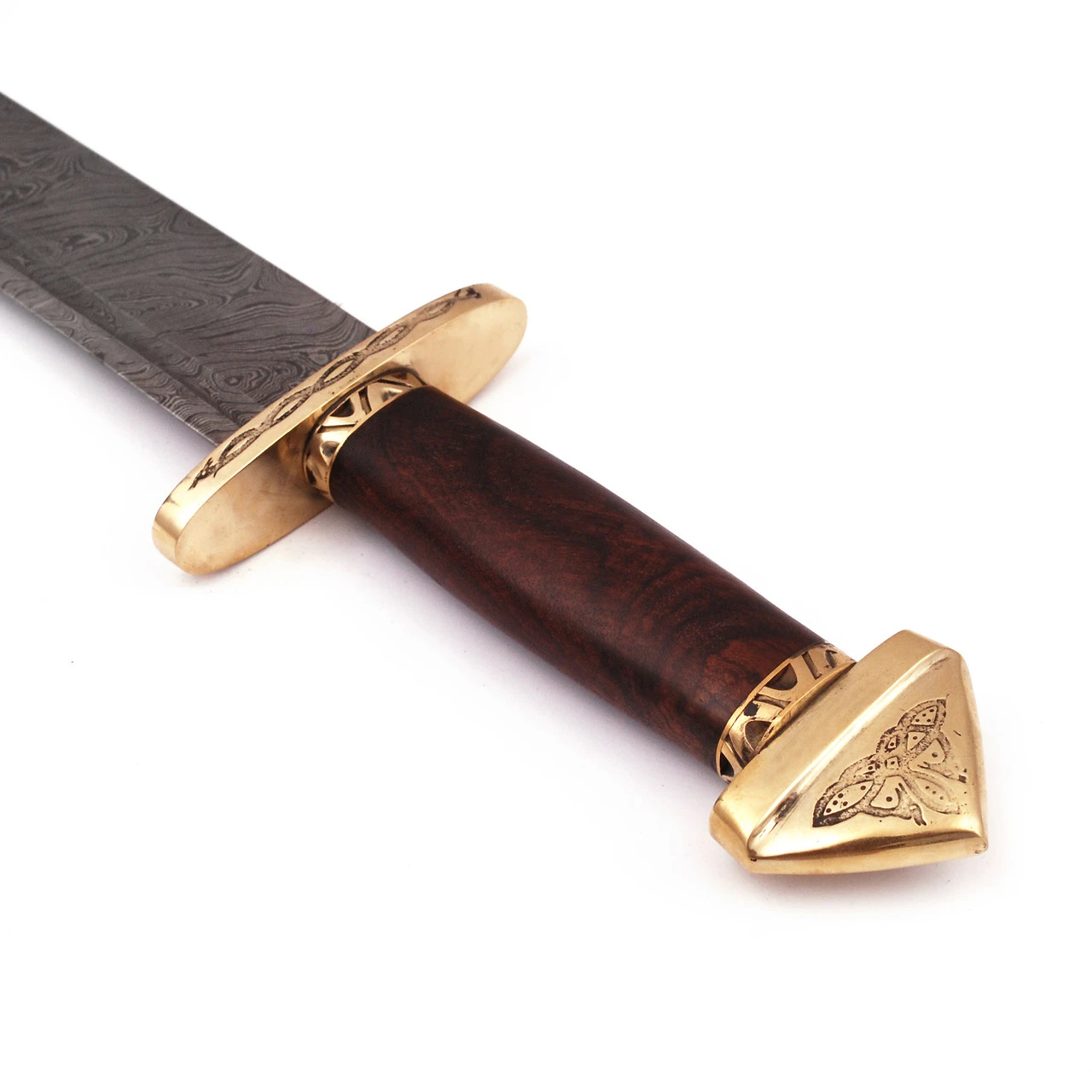 This sword is only for those that fight for Valhalla. With a 24 inch blade forged from Damascus steel, you can definitely say that this is no run-of-the-mill Lang Saex sword. This high-quality 1095/15N20 Damascus has been between 400-520 layers, and has a Rockwell rating of 58-60 HRC. Because of the unique shape of this single edged sword, it can primarily be used as a stabbing weapon, but is just as effective at slashing. The full tang runs in the centerline of the blade, and inserted into a Durable sheesham wood handle that is stained a rich mahogany brown. The guard and pommel are both made of pure brass, with traditional Norse inscriptions etched into them. The included genuine black leather sheath comes with beautiful gold Viking inscriptions as well, including that of a serpent, and is meant to be worn over the shoulder. Overall Length: 32 inches, Blade Length: 24 inches