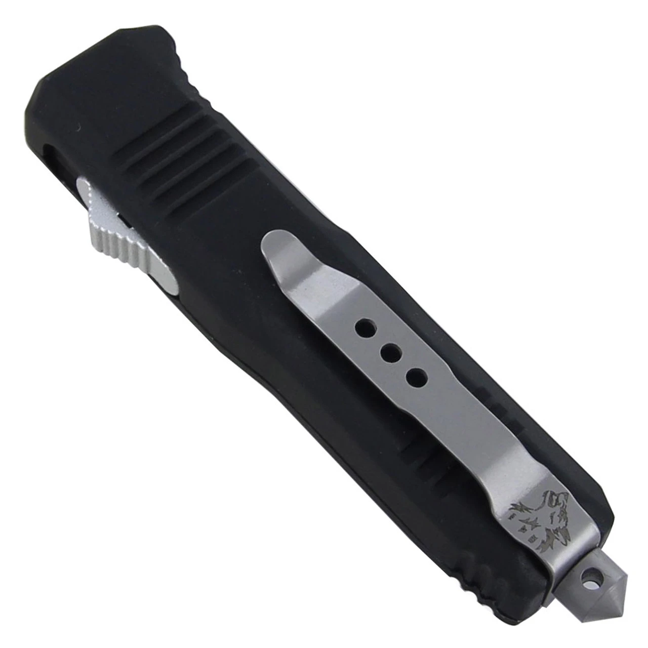 Feel just like the infamous Boogeyman himself. This smaller, more compact version of an OTF knife is exceptional for hunting, camping, every day, military use, or whatever revenge you are seeking. The black and metallic silver dagger point blade is made from stainless steel with a blood groove running down the center. 4 cutout holes are sported on the blade for added detail. A simple matte black coated handle stealthily conceals the blade, which is released by the firing button on the side. A steel pocket clip is mounted on the back of the handle, with a glass breaker on the bottom that makes you well-equipped for any serious situation. These knives feature an improved internal mechanism for more consistent firing. Overall Length (Blade Out): 6 5/8 inches