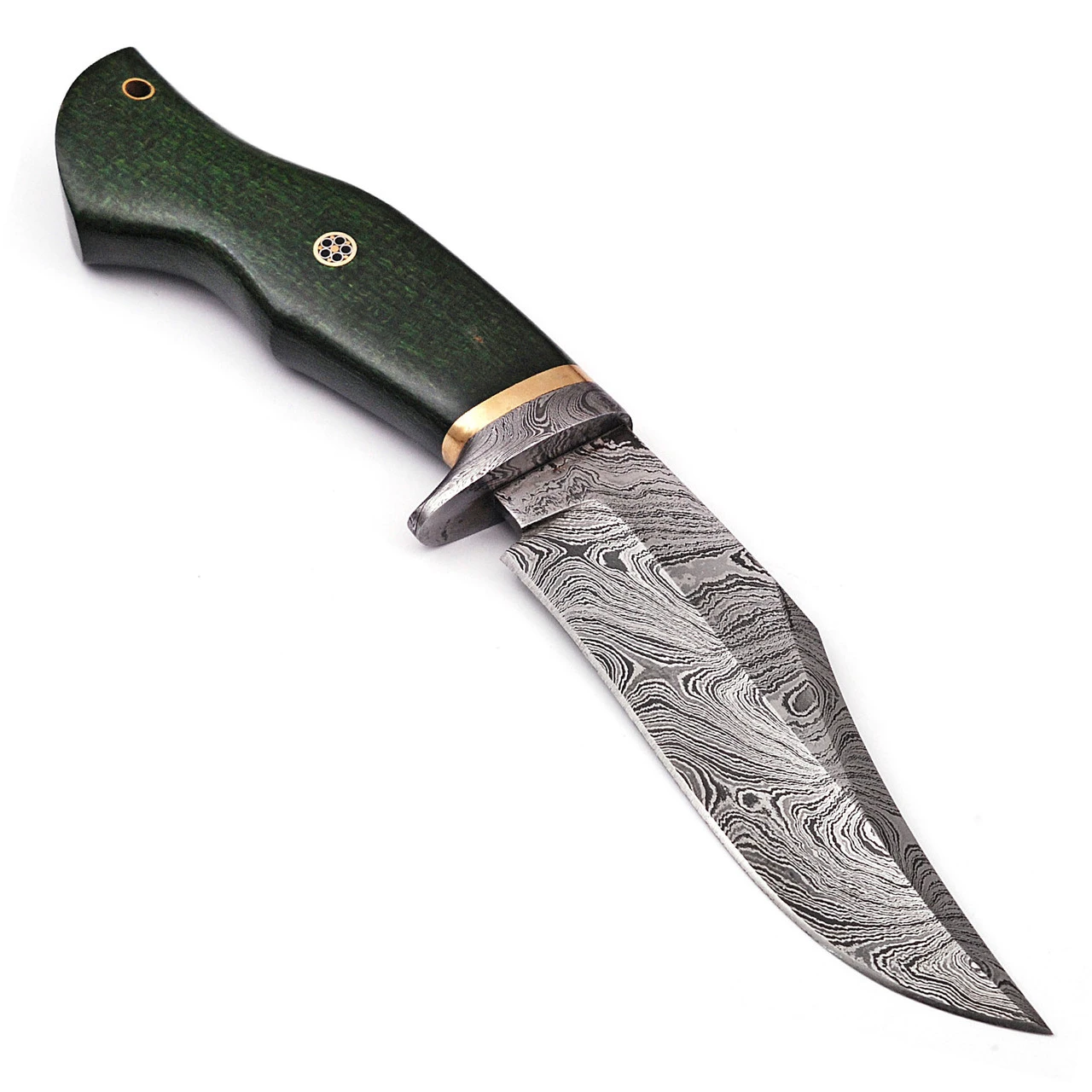 Our Alligator Gutter Damascus Steel knife is perfect for someone who wants a smaller knife that still gets the bigger jobs done right. The Damascus blade is forged from a blend of 1095 and 15N20 steels, folded together approximately 280-350 times to create the stunning wave-like pattern you see here. This clip point blade has a Rockwell Hardness rating of between 54-56. Micarta makes up the contoured handle, and accents the blade beautifully with its deep green color. brass accents make the green pop, and the guard is also made from Damascus steel. A tooled leather sheath is included to house your blade while youโre out and about. Overall Length: 10.75 inches, Blade Length: 5.75 inches