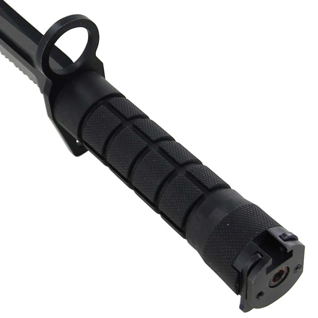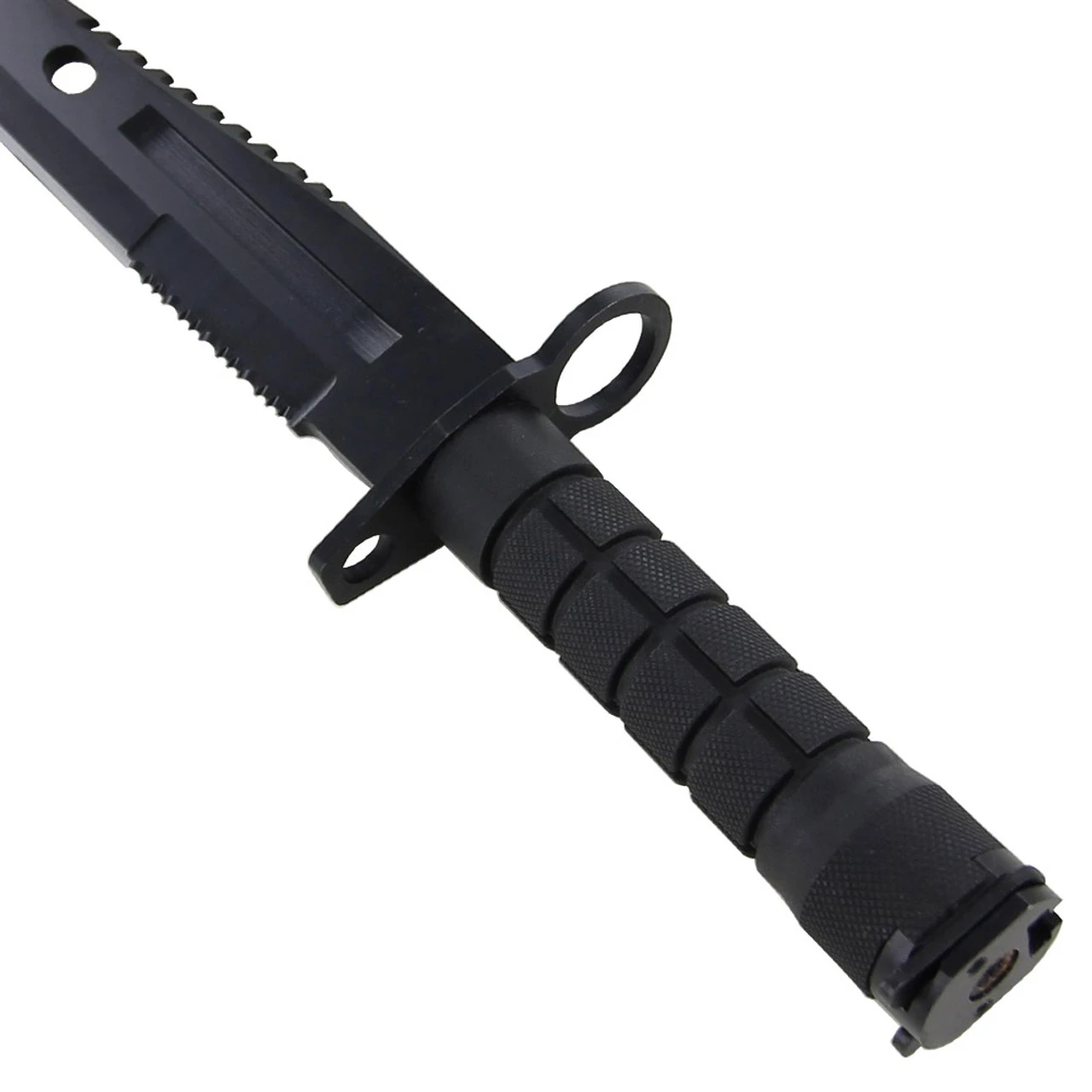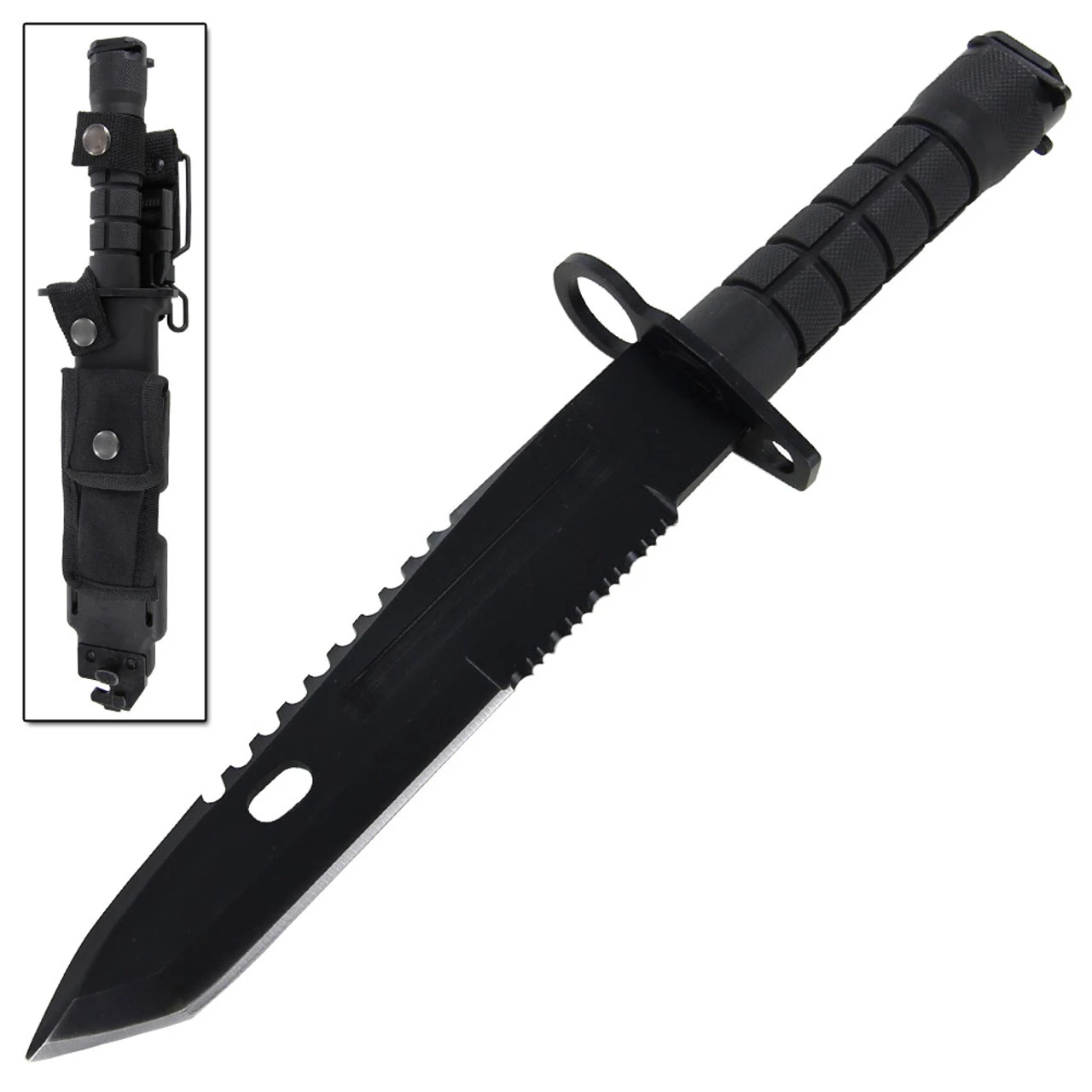 Featuring a 440 stainless steel Black Oxide finish, the blade on this massive bayonet knife sports a special cutout to fit to the wire cutter apparatus on the sheath. The tanto survival knife blade also sports a saw-back with an extremely sharpened edge. The black thermoplastic composite handle features a well-built construction which locks into standard bayonet lugs which the guard slides over your barrel. It also has clearance for common size flash suppressors. It includes a thermoplastic heavy duty sheath built to last with nylon pouch for a shot gun magazine, built-in sharpening stone, wire cutter and an adjustable quick release military holster. You can also strap this blade to your calf. Overall Length: 12.75 Inches
