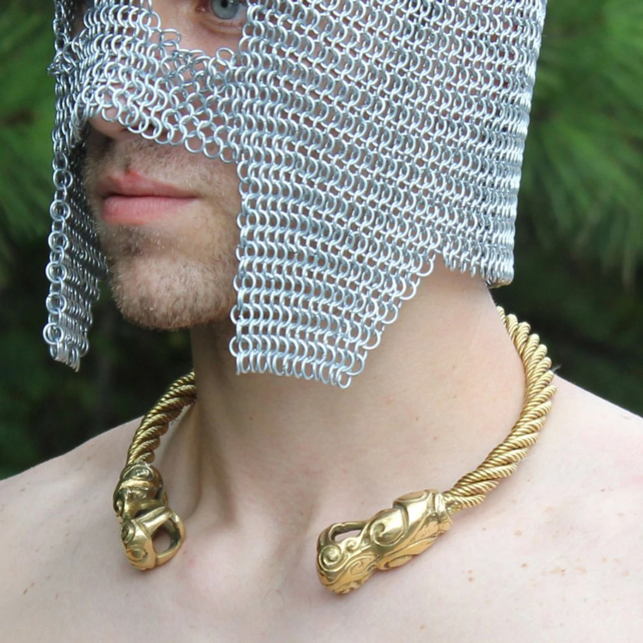 A stunning and vibrant piece of jewelry, this authentically styled Roman torc is constructed from four coiled strands of twisted polished brass. Featuring intricately detailed dragon designs on the end sections, the torc is sized to fit nicely around most necks, making it ideal for any wearer. Also sometimes spelled torq or torque, torcs were large, usually rigid, neck rings typically made from strands of metal twisted together. Though most often open-ended at the front, many were designed for near-permanent wear and were very difficult to remove. Weight: 11.50 Oz
