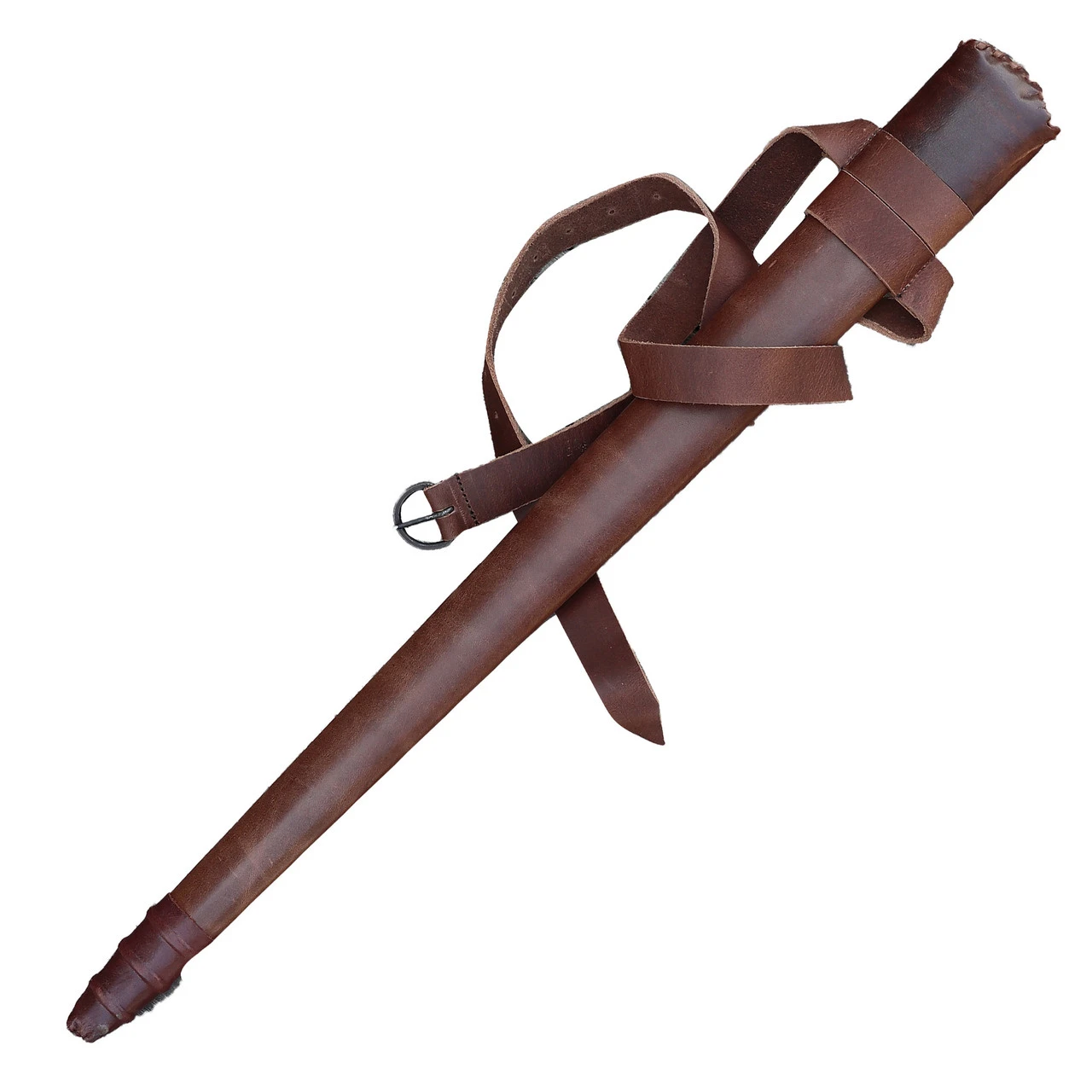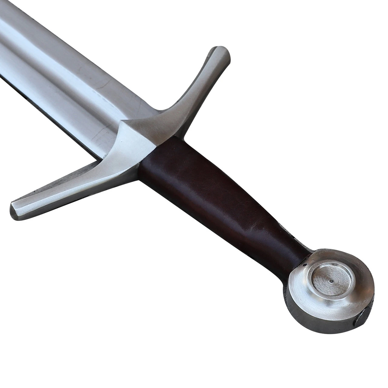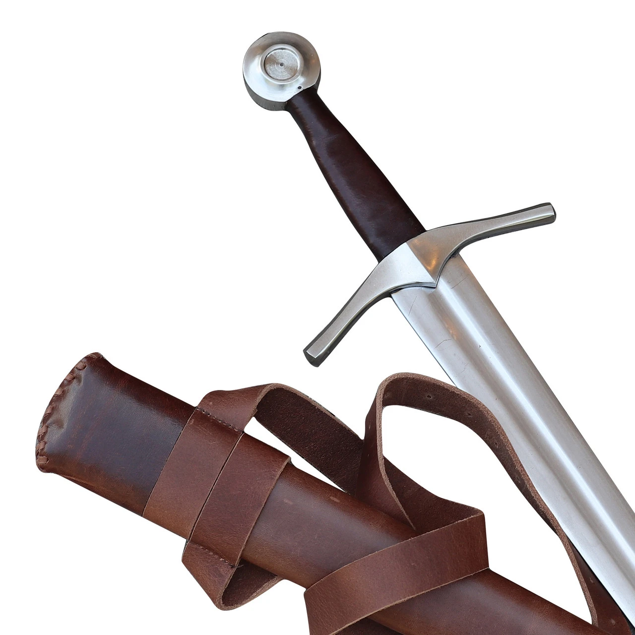 This robust and beautiful functional arming sword is inspired by an elegant 14th century original that can be seen nowadays in the historical Musee De L’armee located in Paris. It is typical of the types of swords worn during the late Middle Age as sidearm for both the knights and the well-equipped men-at-arms. This focus on thickness, weight, balance, flexibility as well as proper distal taper allows for a vigorous weapon that keeps excellent thrusting ability mixed with surprisingly fast cuts from the agile and quick-striking blade. The oiled blade is forged with well-tempered high carbon spring steel and beautifully set with a deep fuller. Where durability is concerned, this sword is simply one of the best of its category! It’s simply perfect for practicing your technique and training to be the best warrior. Its cross guard and round pommel are made of durable steel and are directly welded to a wide and sturdy tang for a nearly indestructible overall construction. But the list of the impressive features of this elegant weapon doesn’t stop here: this beautiful blade not only looks deadly and hard to break, but even the smallest details have been taken into account. The grip is finished with high quality leather and the blade is expertly polished to a fine mirror finish. Not only that, but the sword is also provided with a FREE richly detailed matching companion scabbard with an integrated leather sword belt!