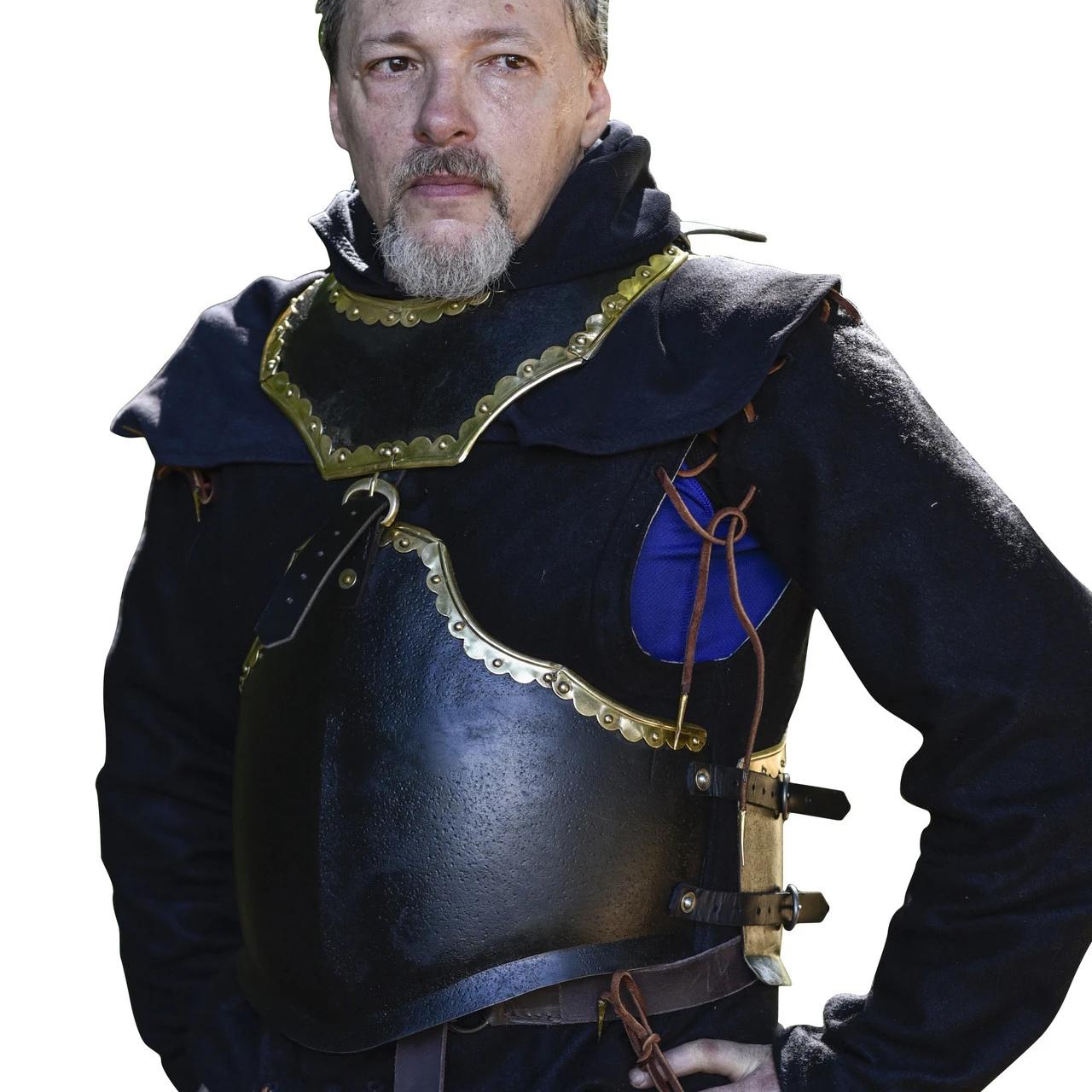 Who has ever said that elegance and deadly efficiency could not make a successful combination? Surely not an experienced warrior! A fighter can look as good as the most experienced veteran or the deadliest black knight and still be able to move freely, twist, bend and even dodge. This 16g steel cuirass and gorget set looks wicked cool with its black iron finish and scalloped pure brass rimming details. The gorget can be attached by an authentic leather strap located on the chest and upper back area of the cuirass. Whether you are very tall, average height, or even quite short, one thing is sure: you will really love the clever way that this cuirass can be adjusted. Leather buckle straps on each side of the cuirass allow adjustment to a custom comfortable fitment. And soon you will see why such simple but light and efficient plackart were popular among XV century soldiers. Just wear it over a nice black gambeson or a sturdy chainmail and you can be sure that you will strike a great impression at your next event! They can be purchased alone or as a part of our deadly beautiful “The Cursed Black Knight” armor set. Overall Length (Cuirass): 14 inches, Overall Length (Gorget): Approximately 5.5 inches, Overall Width (Cuirass): 26 inches, Overall Width (Gorget): Approximately 12 inches
