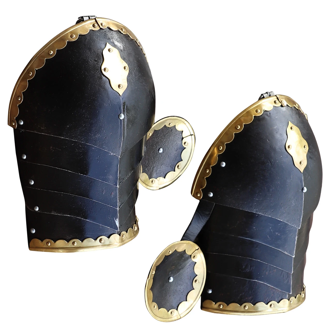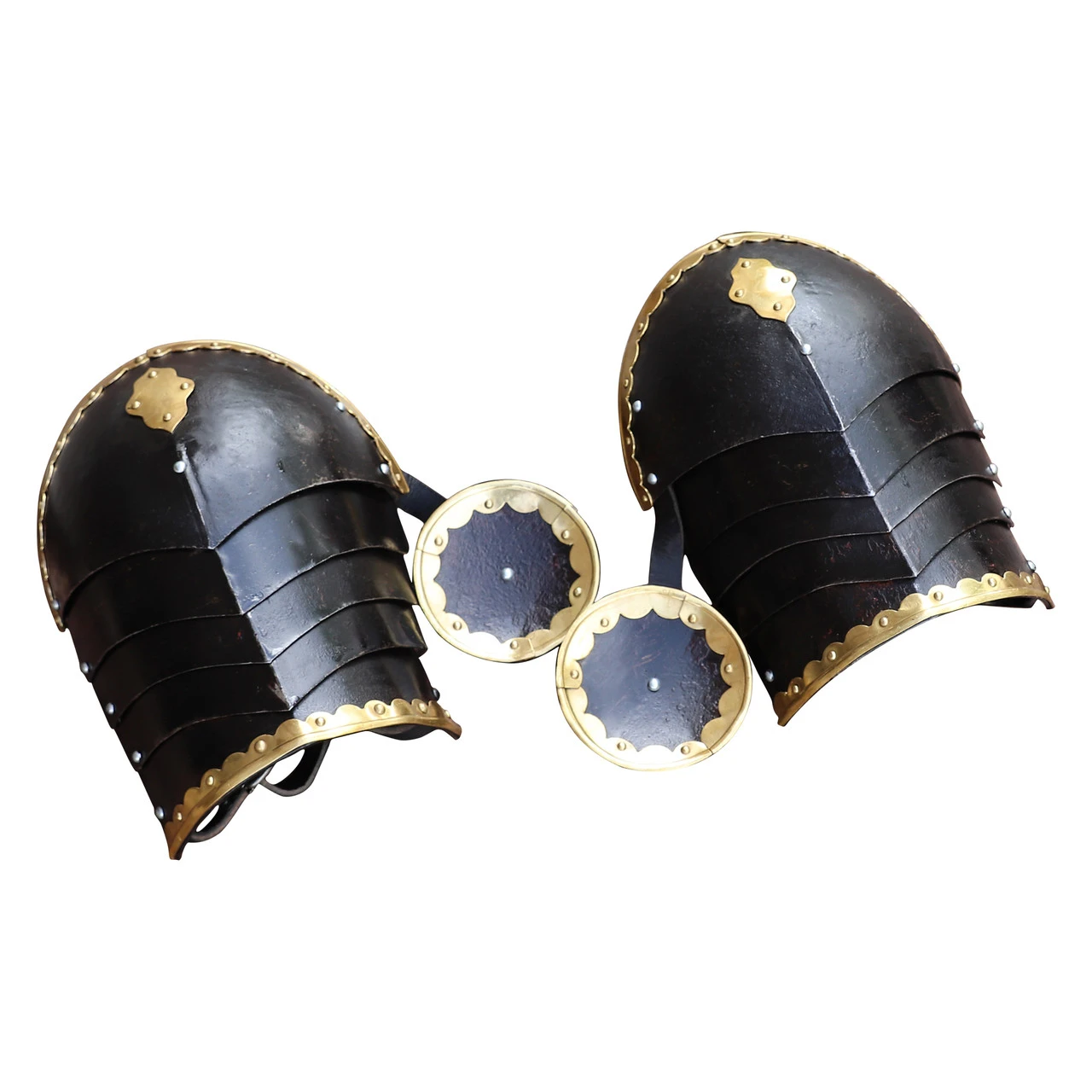These versatile pauldrons are a very important component to the Cursed Black Knight armor set. 16-gauge steel is used to construct these pauldrons, and they are given a wicked black iron finish. Pure brass accents the armor with scalloped edges and details. These pauldrons are especially well articulated and offer good mobility while keeping an excellent level of protection, which make them a good choice for most brave adventurers. The besagues hanging from the pauldrons give them their authentic look and contribute to offer an even better protection for a very vulnerable part of the body. Adjustable premium leather straps provide a customizable fit. They can be bought alone or as a part of our deadly beautiful “The Cursed Black Knight” armor set. Overall length: 12 inches, Fitment: Adult Sizes.