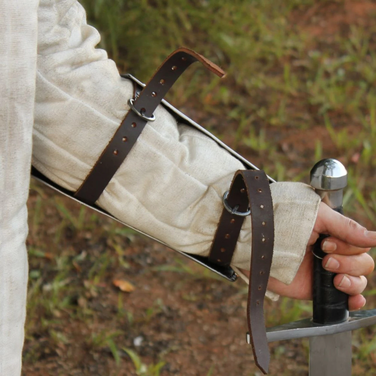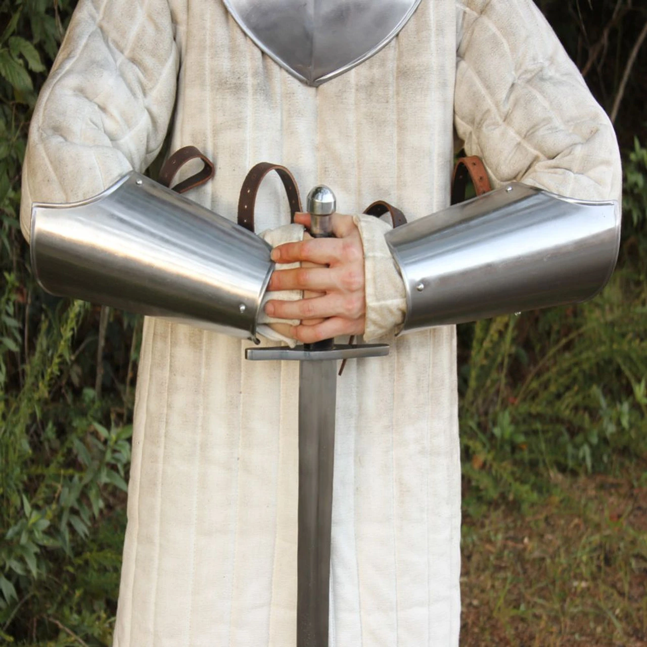 The arms are one of the more vulnerable parts of the body in a medieval melee, particularly where multiple combatants are concerned. This pair of steel arm bracers will go with a large range of period outfits and weapons. The Renaissance Battle Austere Vambraces have a simple, yet appealing design. They feature a smooth polished finish while the interior of the bracers are blackened. The braces are affixed to the arm with a pair of integrated leather straps and antiqued steel buckles. Being fully functional vambraces, they are incredible for SCA events as well as LARP battles or to complete your costume at the next Renaissance Festival.