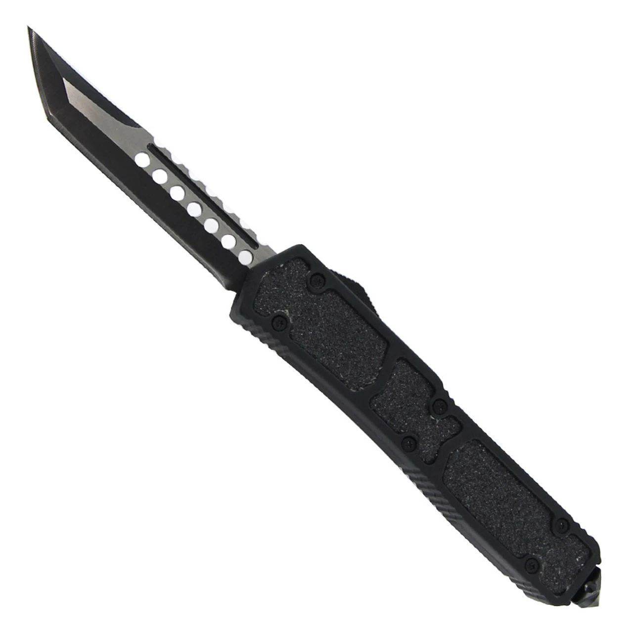 This astounding blade is made from stainless steel in a tanto style.The dual action is a fantastic feature to have and cuts down on reaction time. Just slide the thumb slide back and forth.The handle casing is zinc alloy with sand paper inserts for working in wet conditions. A glass breaker is featured end of the handle with a steel pocket clip.This beauty comes with a quick release nylon sheath too.Overall Length: 8.50 Inches.