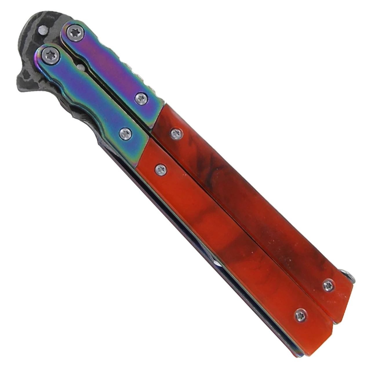 Pocket knives can come in handy in situations as various as cutting through a knot or providing a measure of self-defense. Their big drawback is the need for two hands to fold the blade out of its protective handle. The butterfly or balisong knife solves this problem by offering two free-swinging handles that can be flipped back with just one hand. Due to this configuration, theres an opportunity for creative butterfly knife tricks. This blade is made from Damascus steel that has 176 blade layers and is tempered around 54 to 55. The pattern on the blade is a twist pattern that features swirls and of course twists. The frames of both handles are made from stainless steel. The mounts are made from ABS with an orange colored marble effect and rainbow effect. At the end of the bite handle is a safety latch. At the end of the bite handle is a safety latch. It is no wonder why these knives are one of the most popular knives of today.Overall Length: 8.75 Inches.