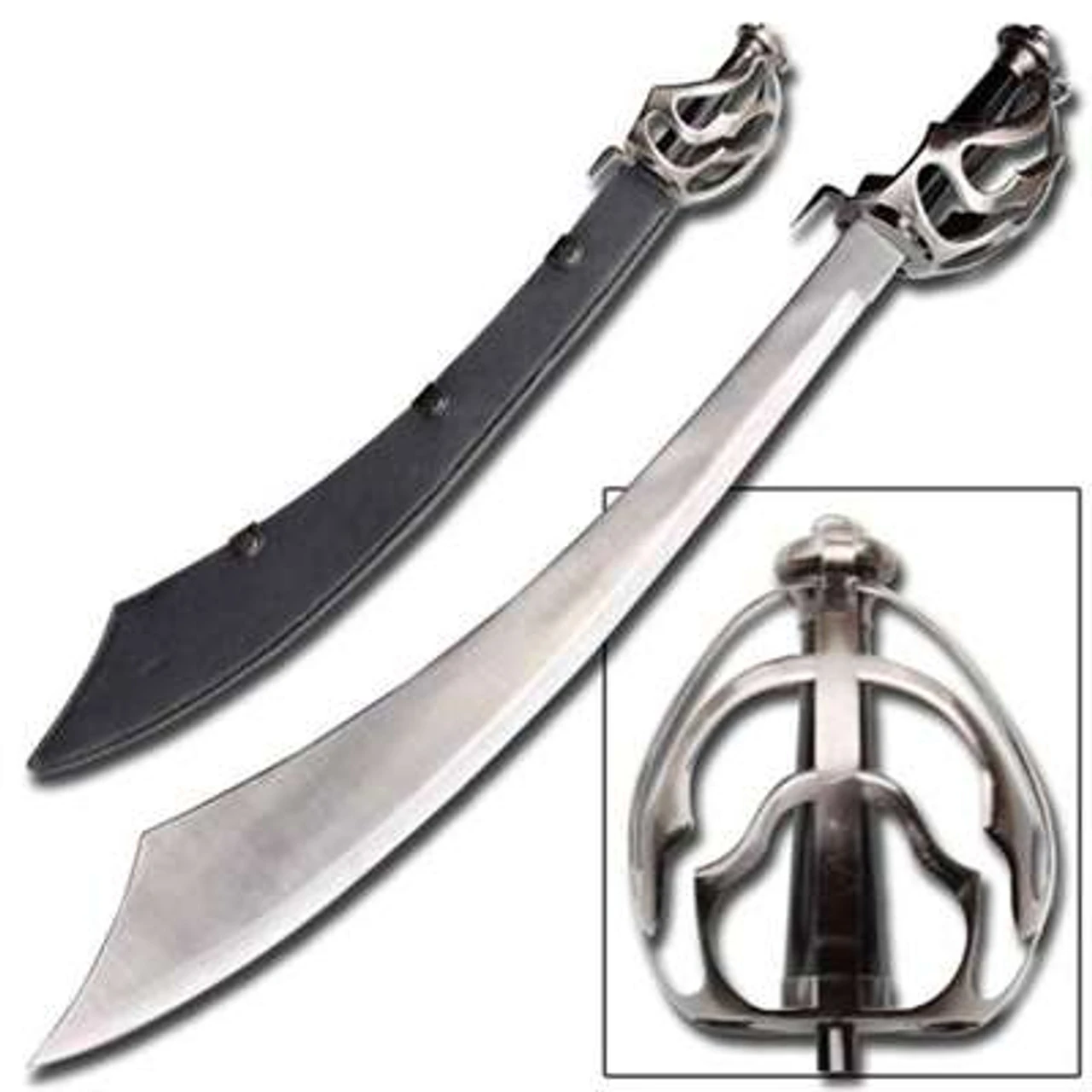With an extreme scimitar curve, this aggressively-styled, thick, heavy blade is ready for pirate endevors. The edge is factory sharpened. A true beast, this amazing monster is more than 3.5 inches wide at its greatest extent and comes with a FREE heavy-duty leather snap fastened sheath.