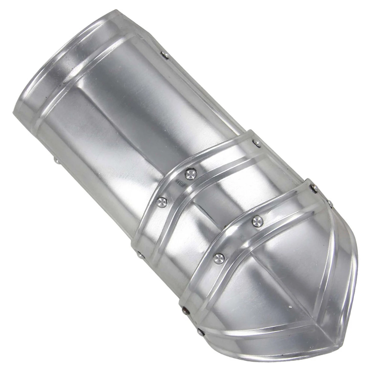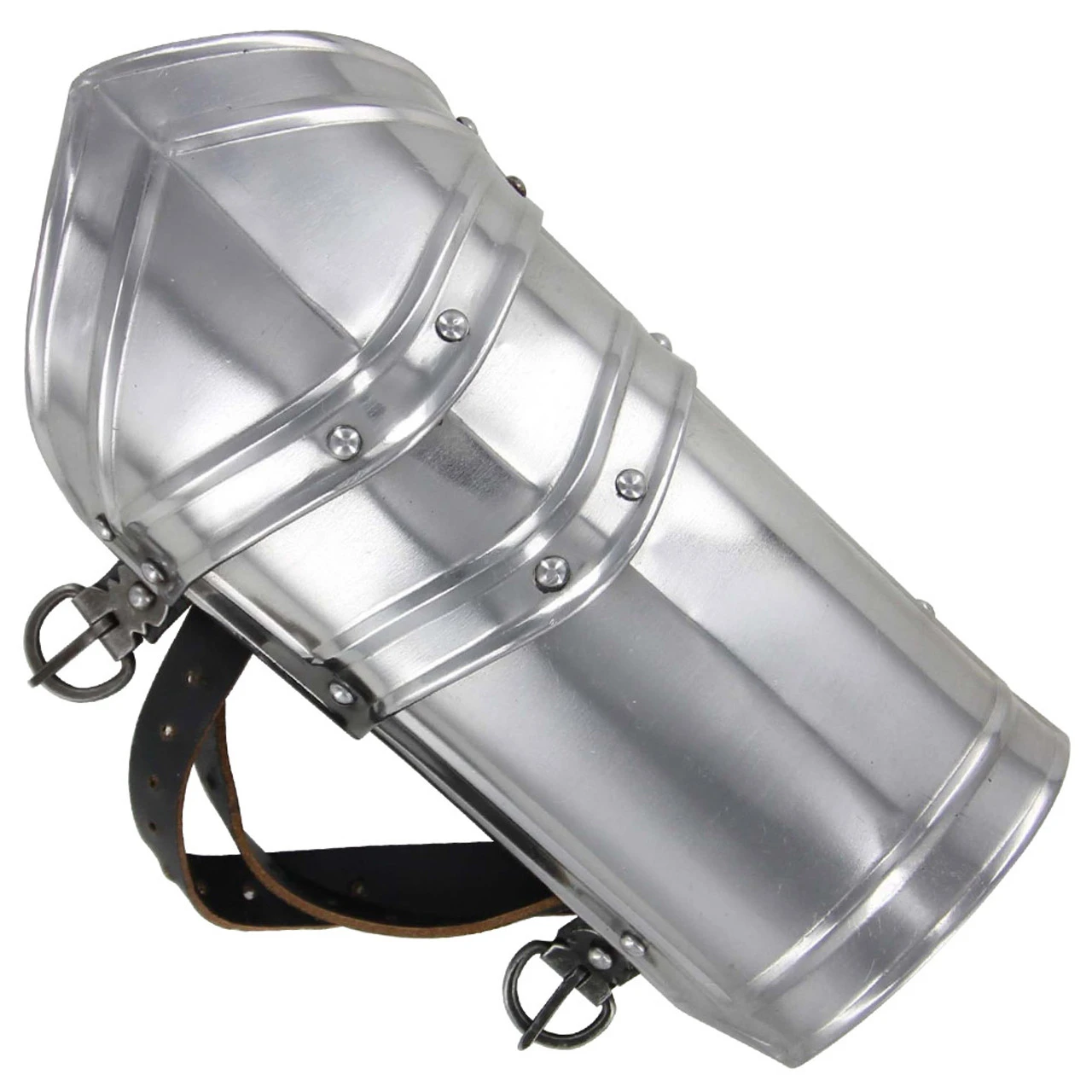 Ready yourself for battle using authentic 18 gauge steel battle armor. Reinforced folds on the edges increase the rigidity of the steel armor. Layers of 18 gauge steel are riveted together to overlap all points of deflection. This armor covers the forearms.