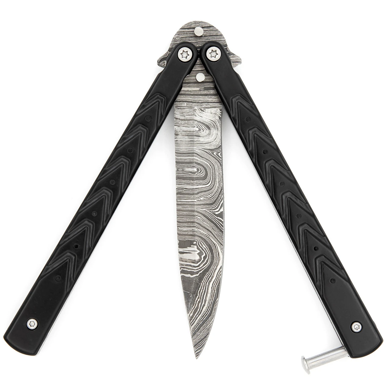 Sporting an interesting drop point Damascus steel blade, the slim build and good weight of this balisong butterfly knife delivers nice action in an attractive package. The distinctive steel construction handle is decorated with an attractive arrow pattern which is finished in a black color; make this butterfly knife a true classic. A metal safety latch is included to lock the blade into place when it is not in use as well as when it is deployed. The spey point blade knife comes complete with a durable hard cover sheath which clips onto your belt or can be fastened through your belt. Also known as a balisong, a butterfly knife or fan knife is a folding pocket knife with two handles counter-rotating around the tang such that, when closed, the blade is concealed within grooves in the handles. Butterfly knives are especially useful in situations where it is inconvenient to use both hands to open a knife. Please make sure to check your local laws regarding the procession and import of these knives. Free Holster, Overall Length: 9 Inches