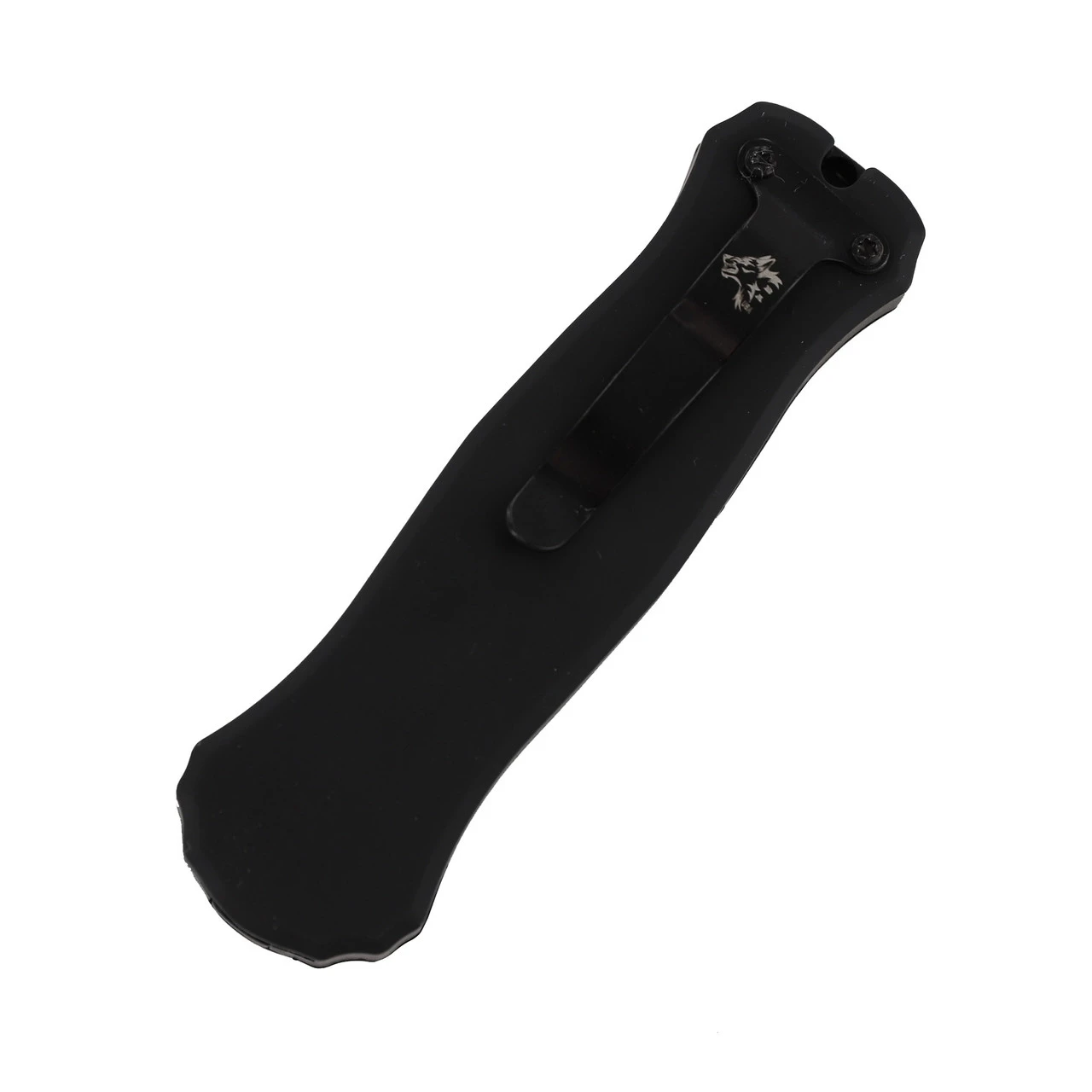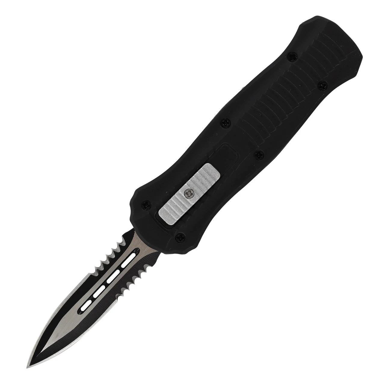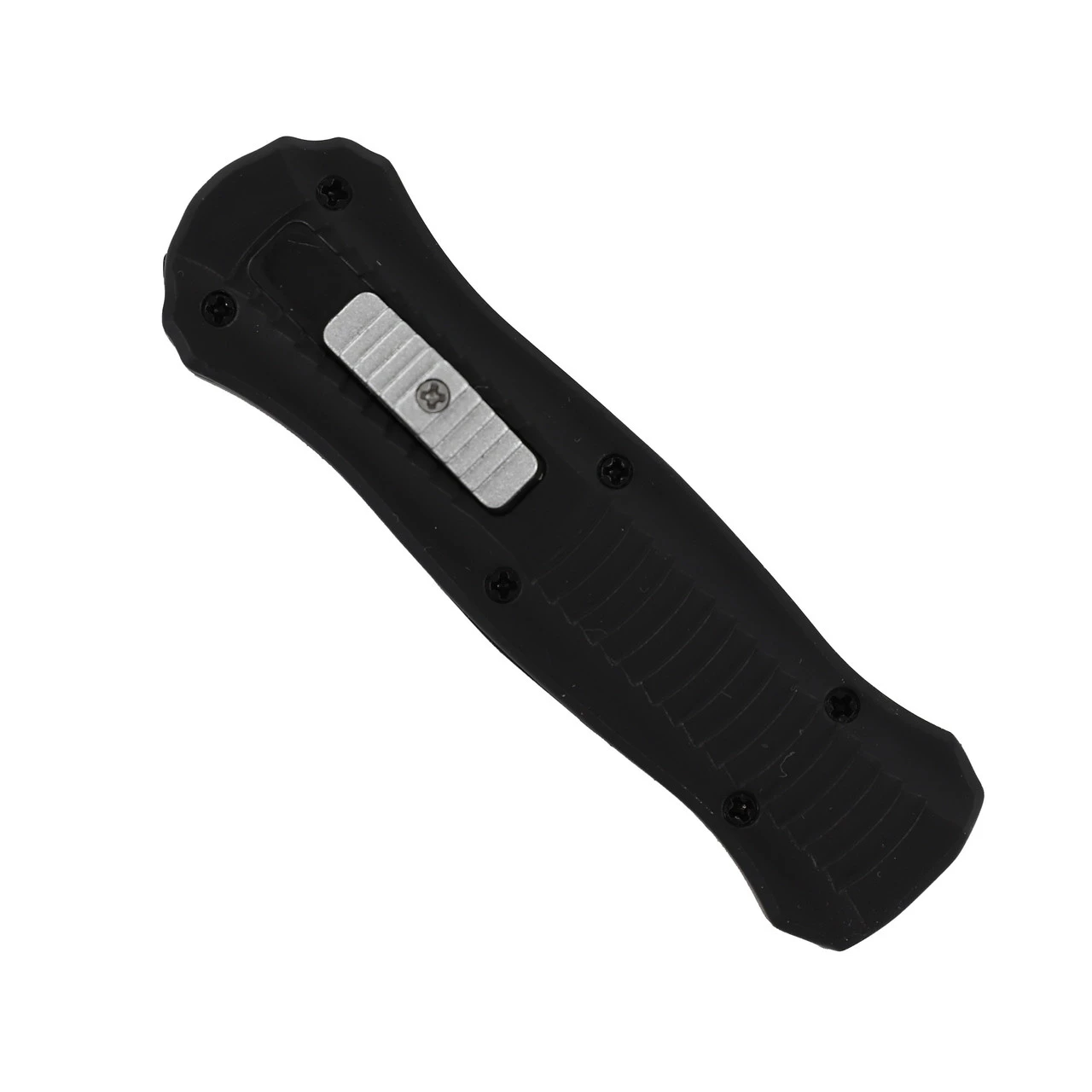 This little guy may not look so tough, but it certainly shouldnโt be underestimated. The stainless-steel blade has a sharp double edge with partial serration, and a dagger point tip. A two-toned finish on the blade adds appeal while offering scratch resistance. The curvy handle is made from zinc alloy and has a textured finish for a firmer grip. A slider is centered in the middle of the handle making this dual action blade ambidextrous. This knife is perfect for on the go due to its conveniently small stature. Included with your knife is a complementary black nylon sheath with belt loop and quick release. Overall Length: 5.5 inches, Blade Length: 2.125 inches