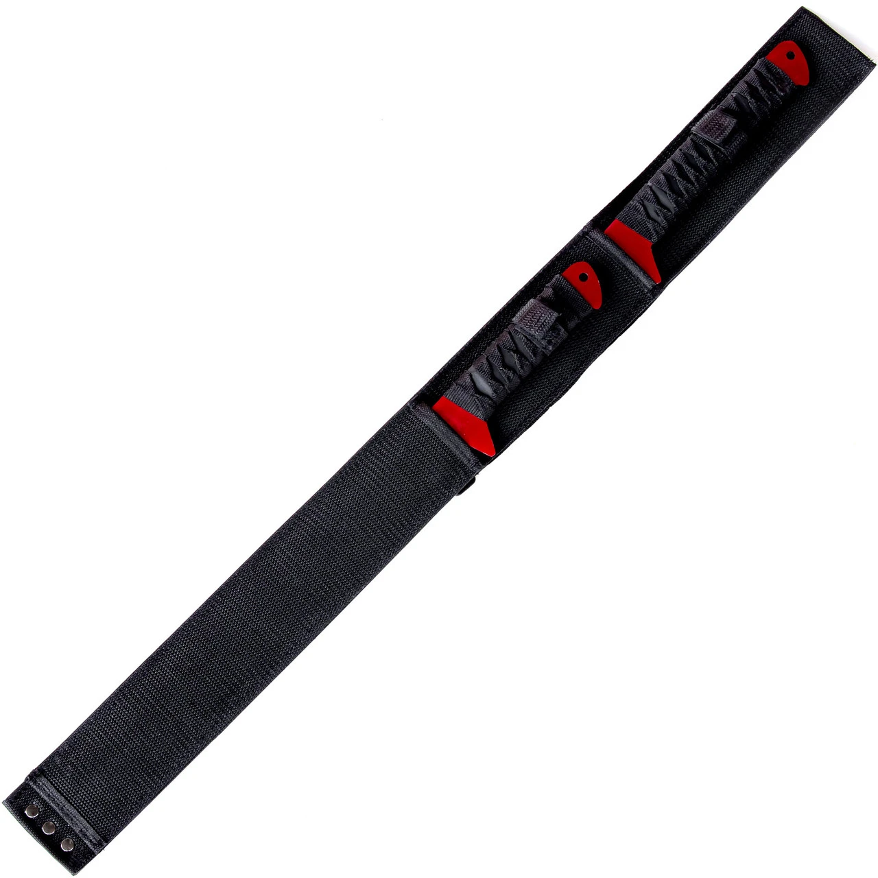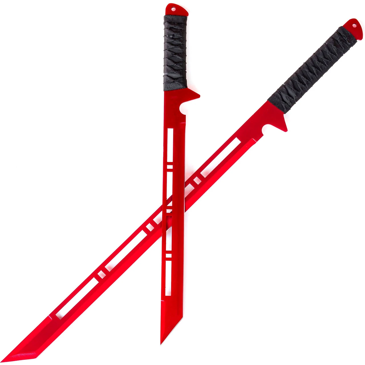 The Blood Moon Full Tang Dual Ninjato Short Sword Set is a set of 2 vibrant red, short, full tang swords. These swords are one complete piece of red titanium coated 420 stainless steel with a nylon cord handle wrap for grip. With one sword featuring an overall length of 26 inches and the other being 18 inches, these ninja swords are a bit shorter than our others which gives them a bit more precision and easier to hold. Cutouts on the blades reduce weight making this set extremely light but effective. The Blood Moon Full Tang Ninjato Short Sword Set also comes with a black nylon shoulder sheath that accommodates both swords for easy carry. Whether it is a functional addition to a costume or cosplay or gorgeous display piece the Blood Moon Full Tang Ninjato Short Sword Set will be the perfect addition to your collection.