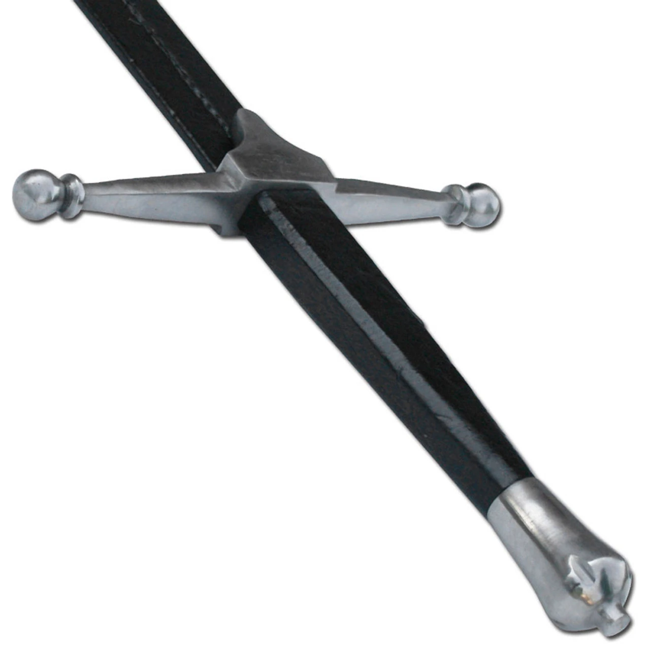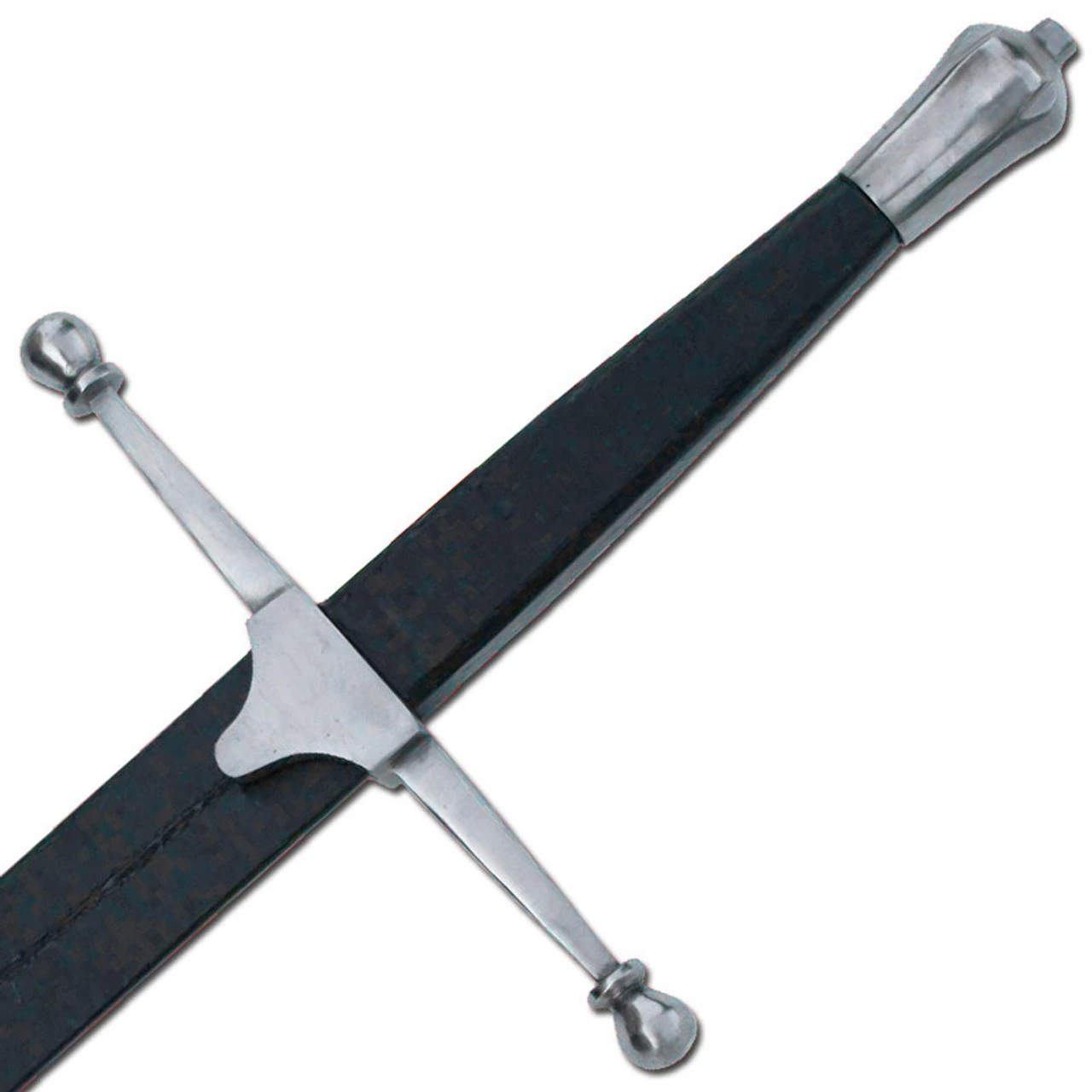 At the base of the blade is an Accurate vinyl leather wrap. The cross guard is about 10 inches wide and features an original Chappe (Rain Guard). The carbon steel blade goes into the solid wooden handle that is wrapped with a formidable vinyl leather and stitched for absolute grip. The weighted pommel has been chrome plated and sports a satin finish. Overall Length: 52.5 Inches. Blade Length: 42 Inches. Blade Steel: Carbon Steel, Polished Surface. Guard Width: 10.25 Inches. Handle Length: 9.6 Inches.