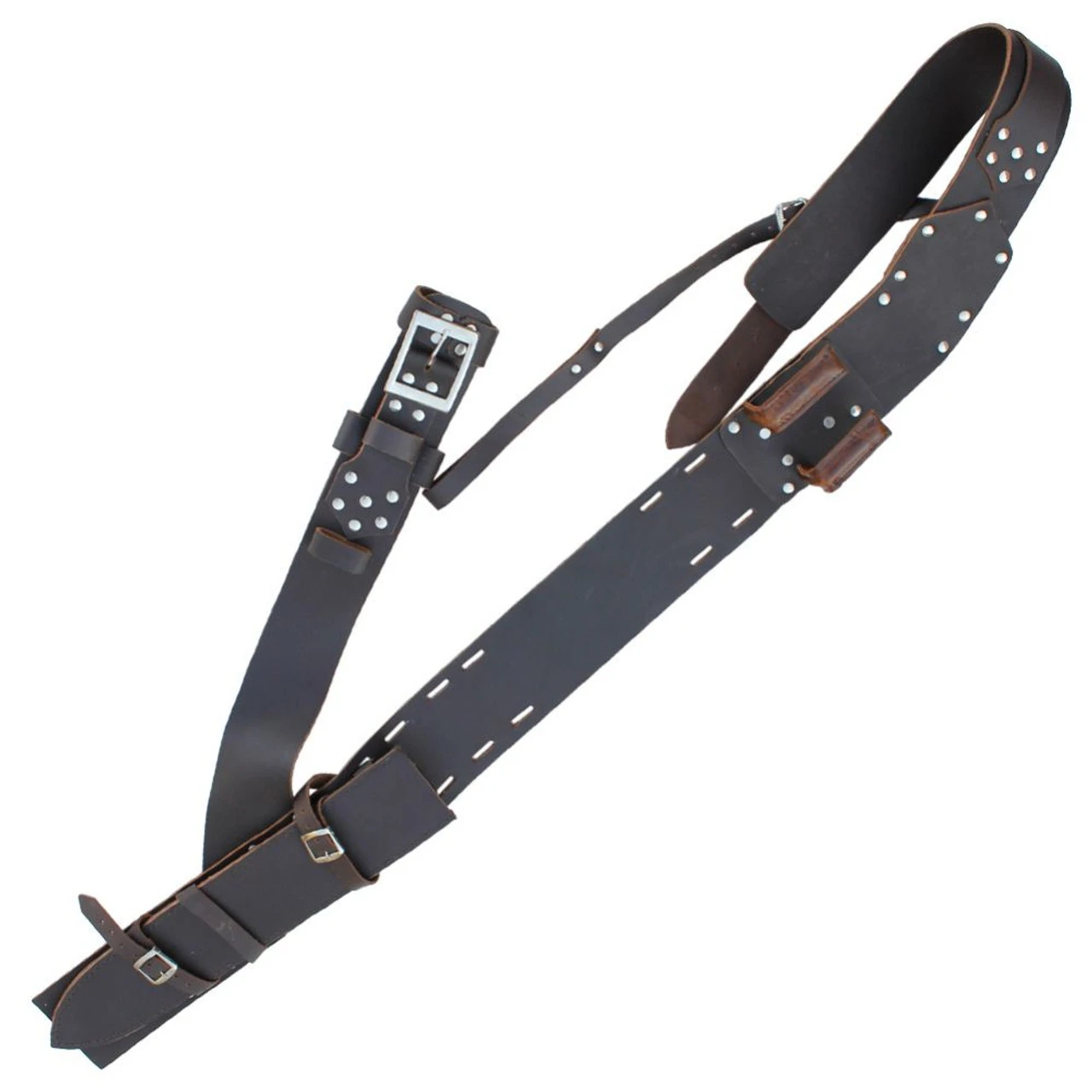 This Cheshire Knights Authentic Leather Baldric is constructed of genuine thick premium brown leather. It is made specifically for Long Swords or Claymores, but can fit most medieval swords. The shoulder strap is adjustable with steel buckles. An adjustable leather thong hangs down from the shoulder strap and attaches to your belt. The scabbard of the Baldric is adjustable and can be fitted to your sword length with buckles.