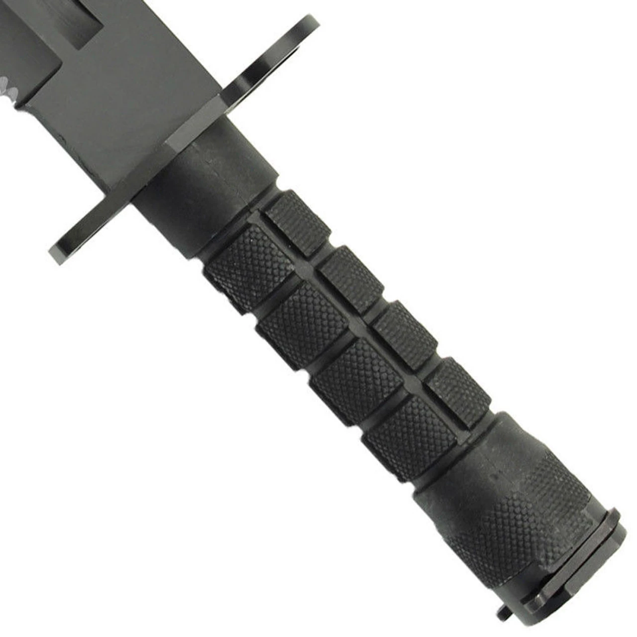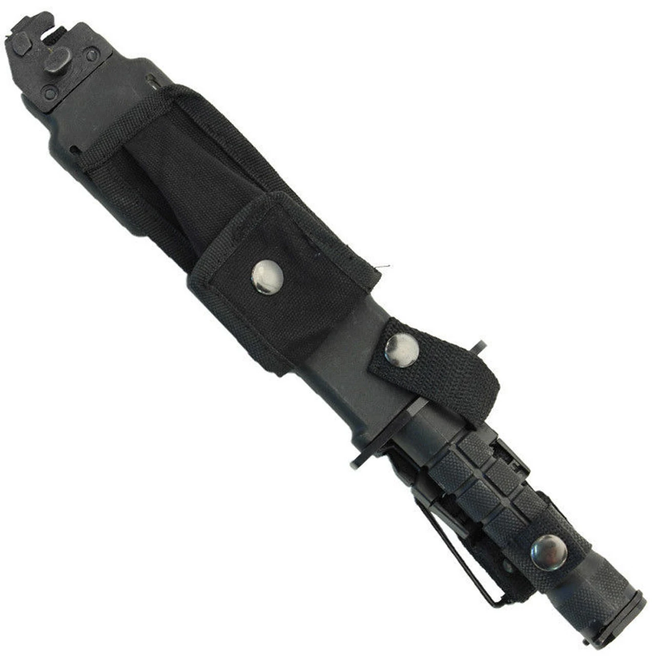 This knife features a 440 stainless steel black oxide finish and sports a special cutout to fit to the wire cutter apparatus on the sheath. The blade offers a tanto survival style with a upper saw-back with partially serrated sharp edge. The handle features a black thermoplastic composite construction which locks into the standard bayonet lugs which the guard slides over your barrel. It also has clearance for common size flash suppressors. The thermoplastic heavy duty sheath is built to last with nylon pouch for a shot gun magazine. The sheath also includes a built-in sharpening stone, wire cutter and adjustable quick release military holster. It has the mechanism to strap this baby onto your calf. Overall 12.75 inches