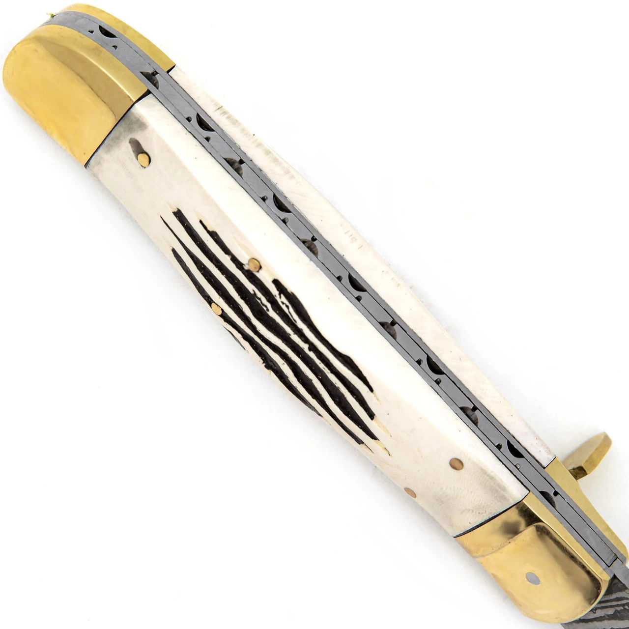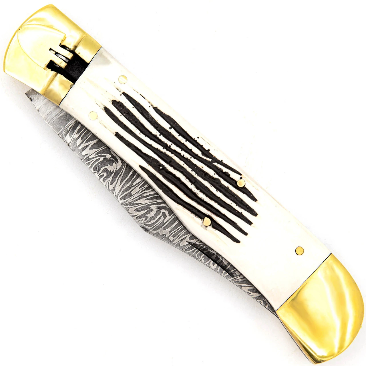 Our County Line Damascus Steel Lever Lock Knife is expertly crafted from only the finest quality materials to ensure you have a functional tool and beautiful collectorโs piece that will last you a lifetime. The Damascus clip point blade is composed from 1095/15N20 Alloy Steel that has been tempered around 54 to 55 with approximately 176 true blade layers. This unique pocket knife features a double wall construction with the inner framing made of sturdy steel. Mounted to the steel framing is imitation stag mounts that definitely pass as the real deal. The spacers, pins, bolsters, and free-falling lever lock are all made from 100% genuine brass with a stunning gold shine. Pushing the lever down with your thumb will effortlessly deploy the blade. A gorgeous semicircle design present on the spine of the handle gives the knife a refined appearance. Included with this knife is a hand tooled belt sheath made from genuine bovine leather and stained a deep brown color. Overall Length: 11 Inches, Blade Length: 5 Inches