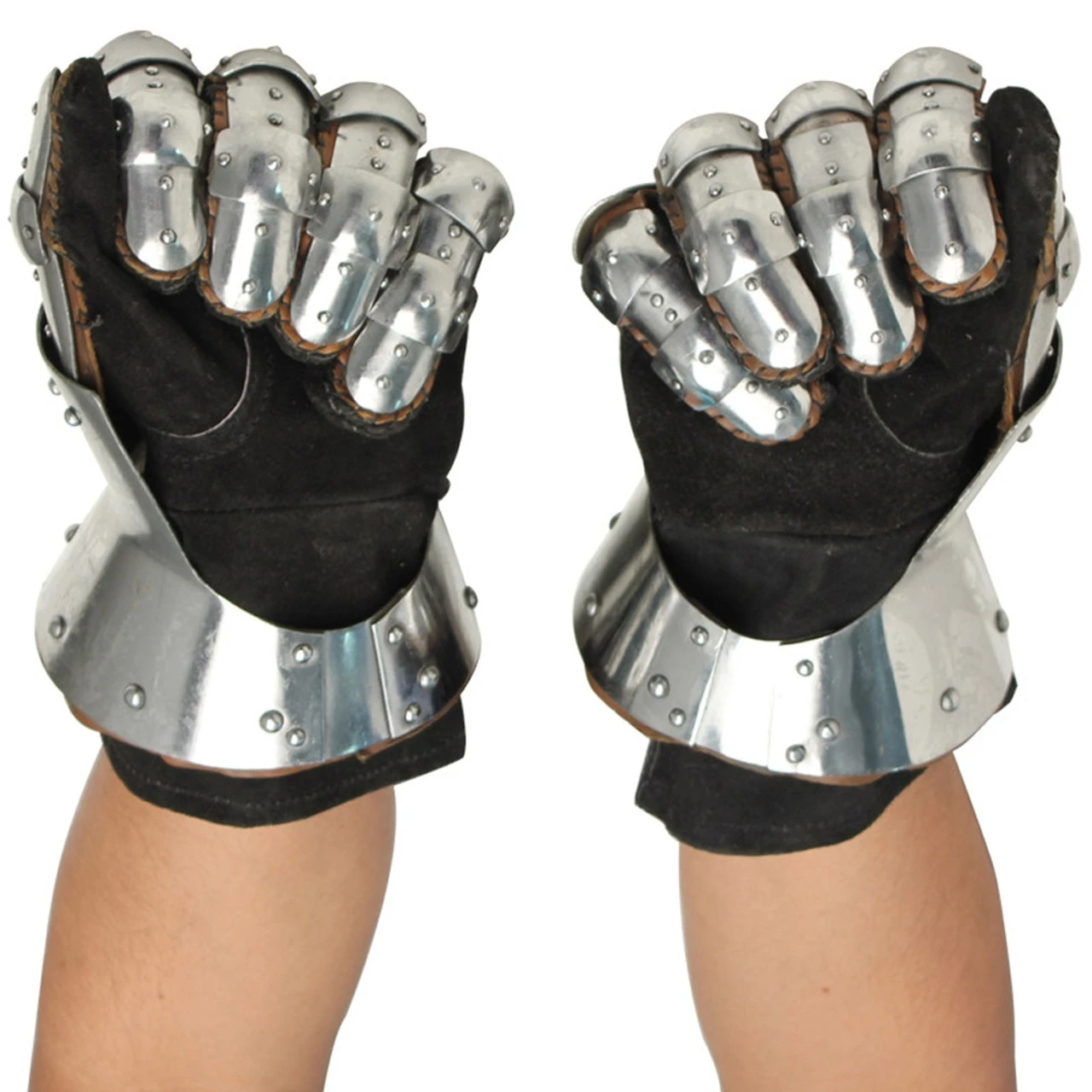 Gauntlets are armored gloves or mittens designed to protect the fingers, hands, wrists and the forearms. Historically, gauntlets were an important piece of armor, since the hands and arms were particularly vulnerable in hand-to-hand combat. Our Crusader Hourglass Gauntlet Replicas are made of polished steel with black suede gloves within the inner lining to protect the hands from the steel by providing cushioning. With steel rivets, these gauntlets are intricately designed. The authentic design allows the fingers to move naturally and the open cuff allows comfortable wrist movement. They are very comfortable to wear, offer great protection for the hand and wrist, and also allow mobility. Overall Length: 10.5 Inches Width: 5.5 Inches Size: 16 Gauge Large.