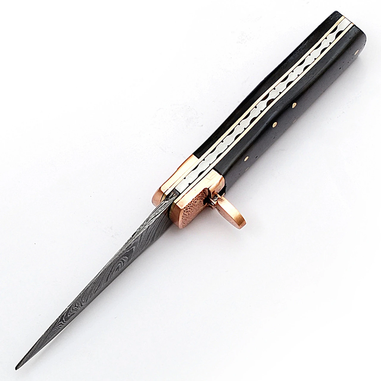 One advantage of Damascus steel is that it has better durability or chip-resistance because of the way it is made. This Damascus steel is forged from 1095/15N20 steel with a Random pattern. These metals are manipulated specifically for the intended purpose of hunting, fishing, and cooking. There are 180 blade layers with a temper of 54 to 56. The handle is made from bone with a genuine brass frame. When closed the blade fits snug into the double walled handle. The copper bolsters come with a textured design and the front features a free falling lever. Press the lever and watch as the automatic function takes effect.Overall Length: 8.13 Inches.
