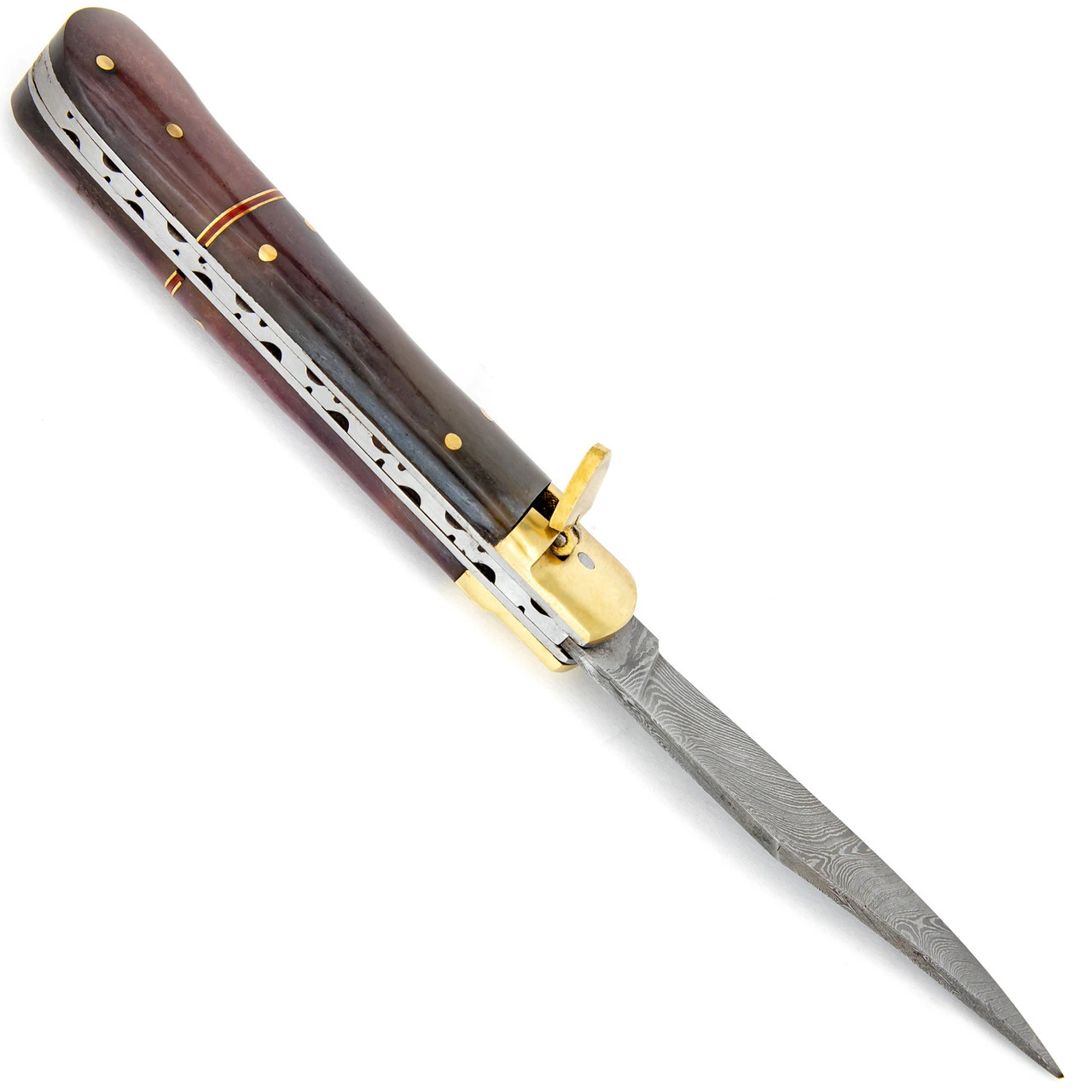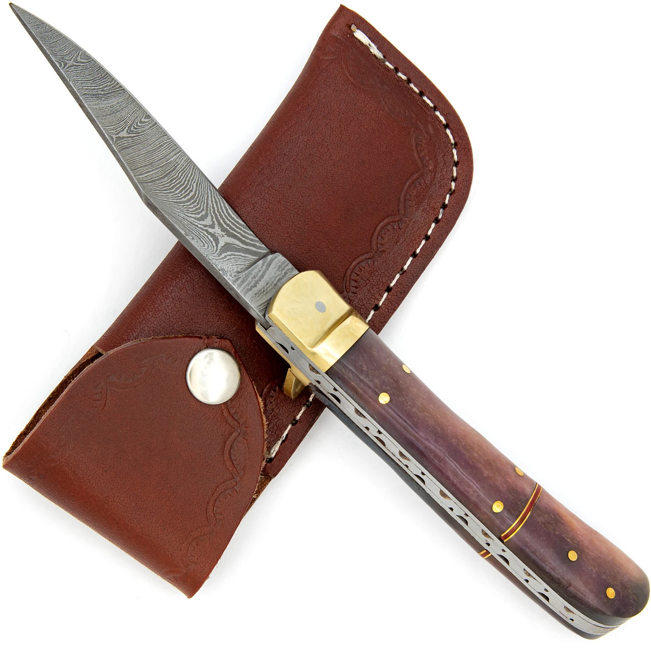 The Admiral is made from hand carved camel bone and stained with a lovely muted red. All four mounts have been hand polished and smoothed for a velvety touch. The spacers, pins, bolsters, lock, and inner frame are all made from genuine brass. The handle comes double walled for long lasting use and durability. The spine comes with custom file work that creates its own art form that adds to the integrity of the knife. The blade is made from Damascus steel with its signature unique patterns. The Damascus is made from 1095/15N20 Alloy Steel that has been tempered around 54 to 55 with a 176 blade layers. The clip point blade offers a sharp cutting edge. The automatic function is outstanding just press the lever on the bolster downwards to fire the blade. True to the original design the lever moves freely up and down with no stiffness. This is an amazing blade with attractive features. Enjoy this hand forged custom blade at work or at home. Overall Length: 9 Inches. Weight: 0.5 lbs.