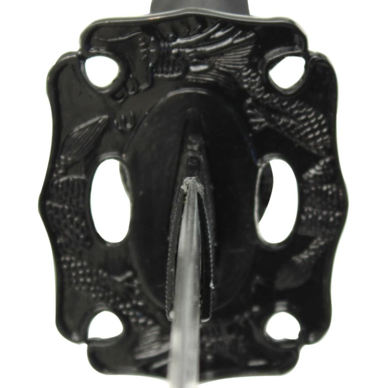 This black, low gloss wooden scabbard features full sized Kenji dragon carving down and around the length of the scabbard and sports a traditional Sageo (cord) wrapping with a bull horn style which is used as a dual purpose for staying with the traditional look of the sword or for hanging. The black two dragon Tsuba (guard) design is a unique feature alongside the detail at the Koiguchi (scabbard mouth) which is also black in color with an intricate art detailed Habaki (blade collar). The Tsuka (handle) features a traditional black nylon ITO braid which can be found on many authentic Japanese swords. The most elaborate detail is located on the Kashira. Here you can see two dragons; one on each side of the swords Kashira. Overall Length: 39 inch