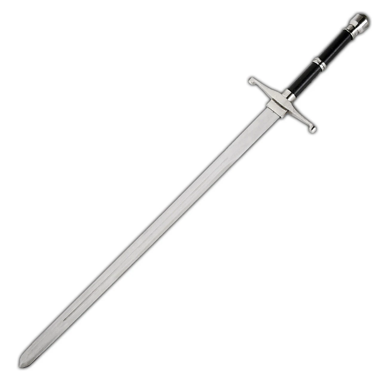 It features a solid stainless steel construction. The pommel, handle and guard is stainless steel with part of the handle wrapped with black leather. The blade is a mirror polish with a blood grove running down the middle on both sides. The sheath is all leather with two tone, red and blue to match the one Trunks carried in DBZ. The sheath also comes with an improving adjustable back strap. Overall Length: 43 inches