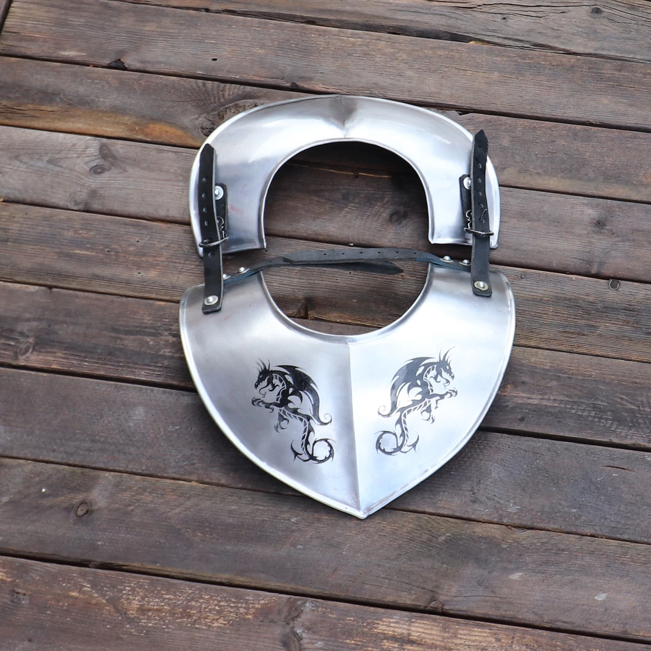 Gorgets are worn with armor as a way to protect the upper chest, neck and upper back, and also serve as an anchor point for pauldrons. This gorget is forged from 18 guage solid steel, with the front plate decorated with 2 mirrored fearsome dragons. The leather straps used to attach the plates together are completely adjustable for a comfortable fit. Add this to your armor for an impenetrable barrier with a hint of style.