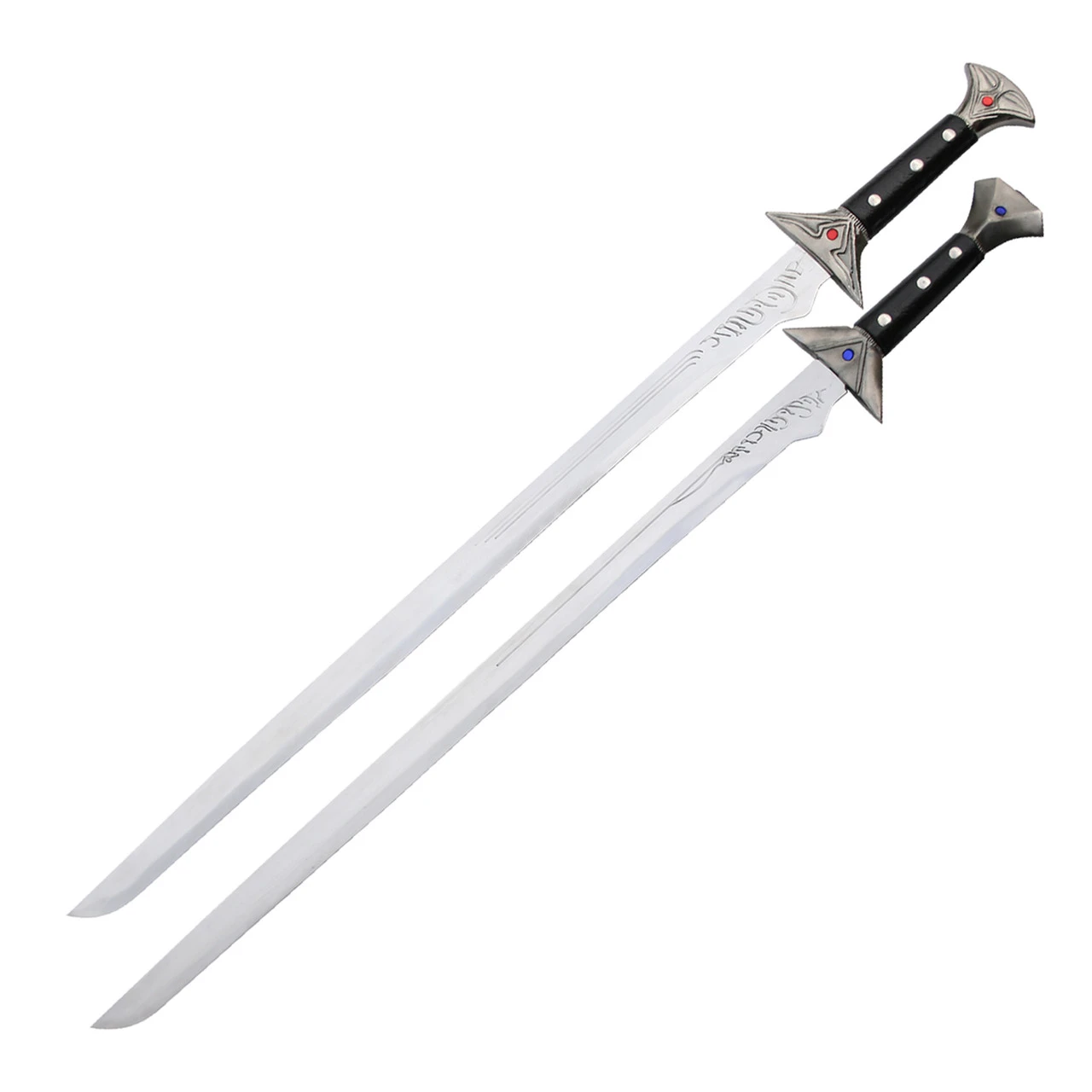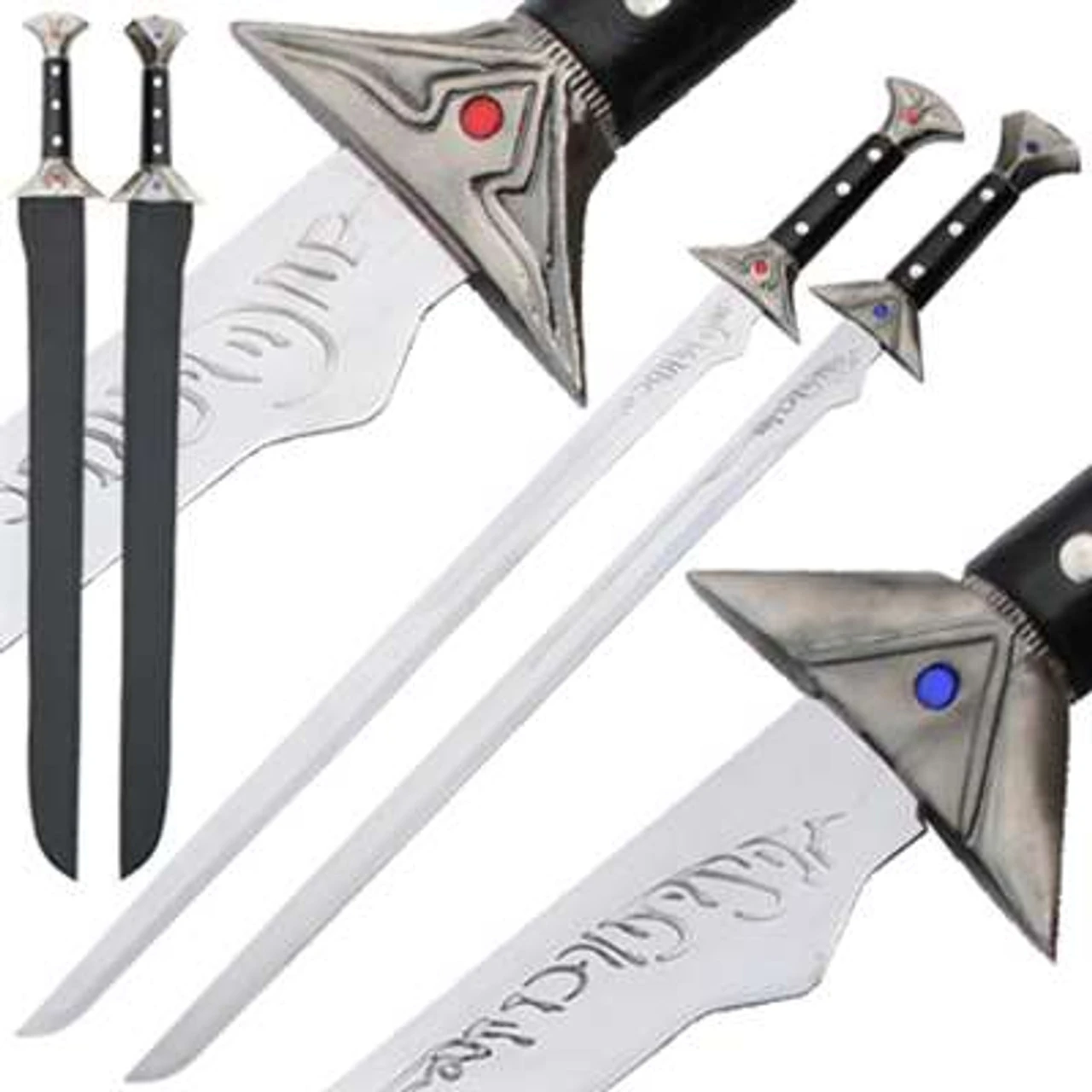 Feature a full stainless steel pommel and guard with a black leather studded to the handle. Each of the swords comes with its own color gem, one red and one blue. Both guards and pommel also share different shapes and designs. The blade comes 440 mirror polish stainless steel with different engravings and is factory sharp. The Icing death and Twinkle Scimitar sword comes complete with two genuine black leather sheaths with belt loop.