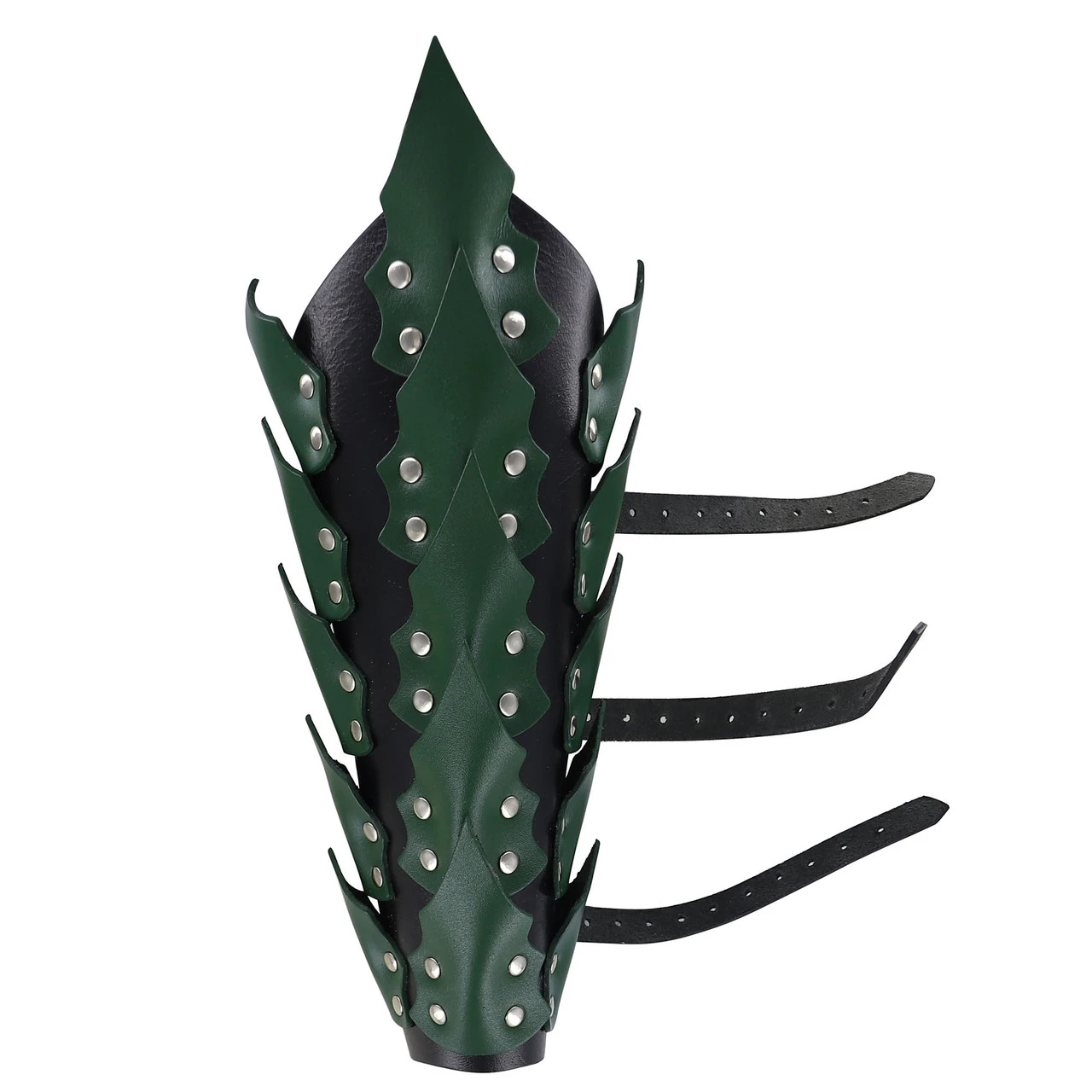 Our Drogo’s Wrath Arm Bracers would not make a complete set without our Drogo’s Fury Leg Greaves. They say that those who possess the Wrath of Drogo are some of the most terrifying warriors alive. These fighters will take down their opponents by any means necessary. Some would even say that these warriors bring with them the fires of hell. This greave was made for such a warrior; one with the heart of a dragon and a thirst for blood. The base is made from thick genuine bovine leather, with leather plates that protrude from the base to add dimension and give the look of dragon scales. The scales are held on with durable silver hardware. The back of the greaves has adjustable leather belt straps for a customizable fit. Bring forth hellfire and brimstone on the battlefield, because this greave is fully intended for use and can withstand heavy blows. With the power of Drogo’s Fury, nothing will stand in your way. Colors Available: Black and Green, Brown *Please note that these are sold individually.