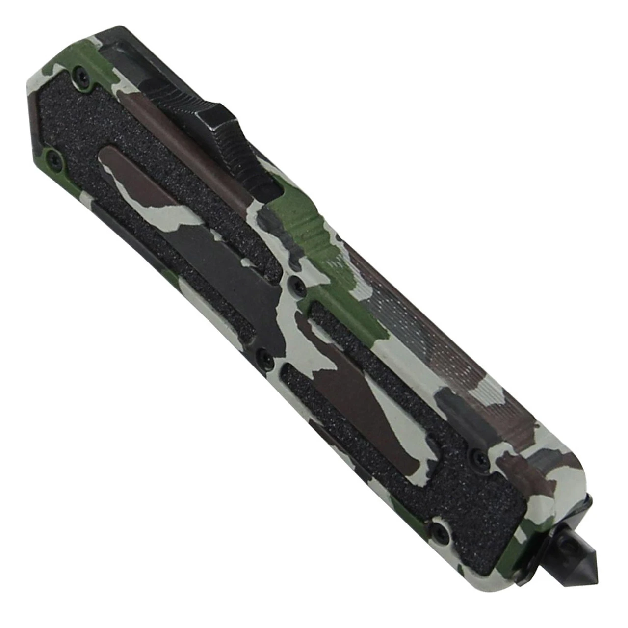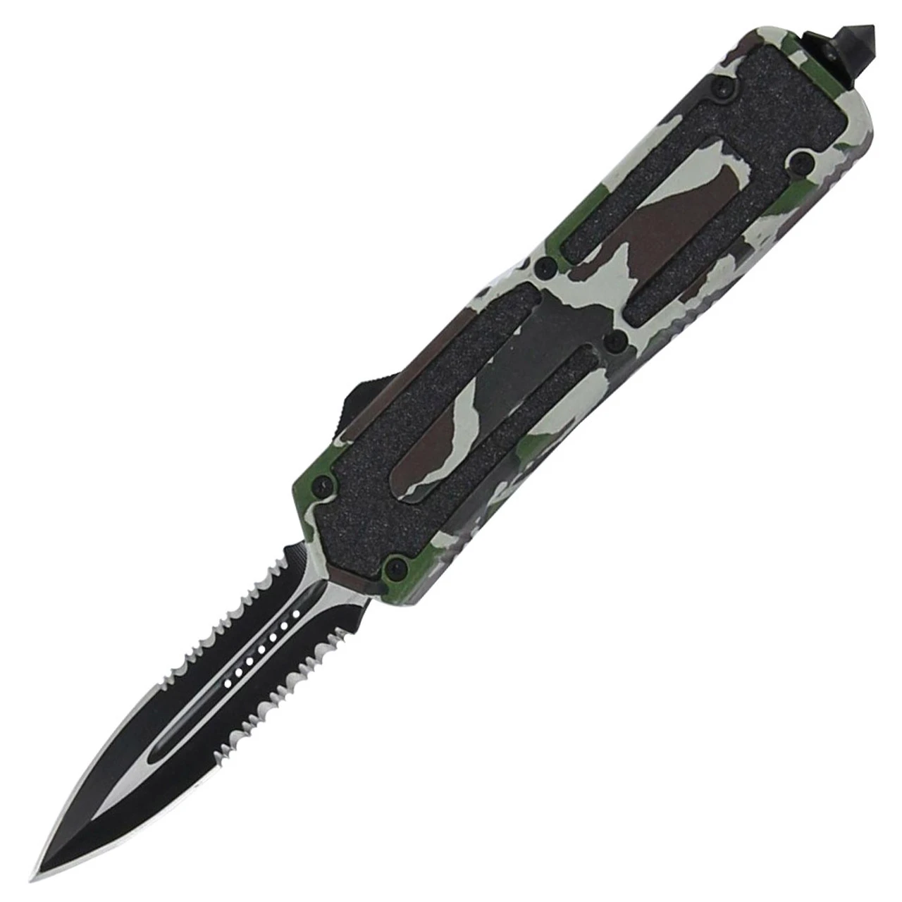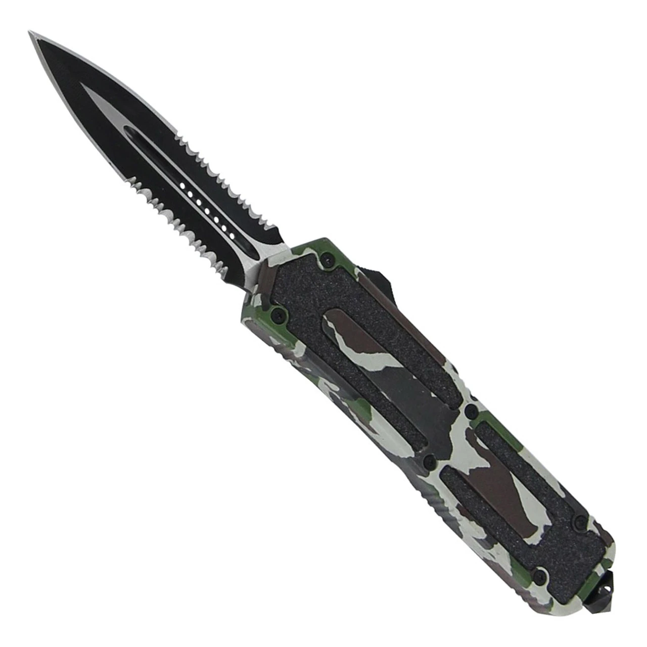 This double edge knife comes with a partial serration on both sides for a different cutting edge. The blade is made from stainless steel with a two tone finish. The zinc alloy handle casing has an operation combat pattern. The inserts are black sandpaper to add texture for working in wet conditions. The thumb slide is located on the side for activating the dual action and deploying or retracting the blade. A reversible pocket clip is provided and made from steel. Heavy duty from tip to end this working mans knife will not disappoint. For emergencies a punch is located on the butt and included is a quick release nylon sheath.Overall Length: 8.50 Inches.
