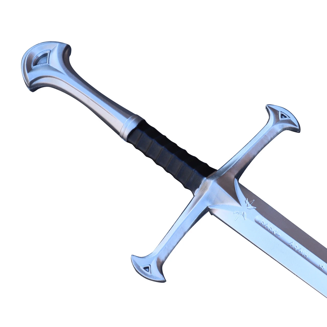 This sword is greatly inspired by the sword made for Aragorn from the remnants of the legendary great sword, Narsil. The 42โ replica foam sword is constructed from durable polyurethane foam and has a 10 mm inner core, so it can withstand play fighting while retaining its shape. The handle features a ribbed design with a black finish, and is surrounded by a pewter-painted pommel and cross guard. Overall Length: 42 inches, Blade Length: 32 inches