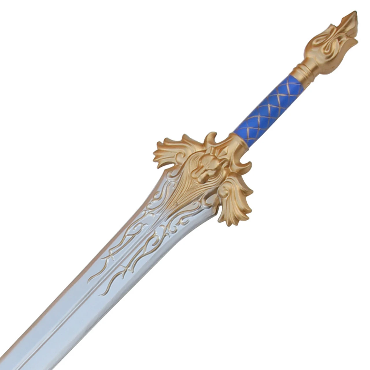It is constructed of polyurethane foam with a 10mm inner core. The inner core makes this sword durable and able to take blows without breaking. The Artisans painted this sword with such care that it emphasizes every detail to bring about a truly amazing piece. The pommel is golden with a unique tulip design. The grip comes in royal blue with golden accents befitting royalty. The cross guard is a regal lion with a full flowing mane and scroll work. The broad blade is painted silver with a fuller down the center. As a symbol of hope for the Kings guard to blade is a must. Wield this beauty as the finishing touch for cosplay or LARP costume.Overall Length: 40.50 Inches.