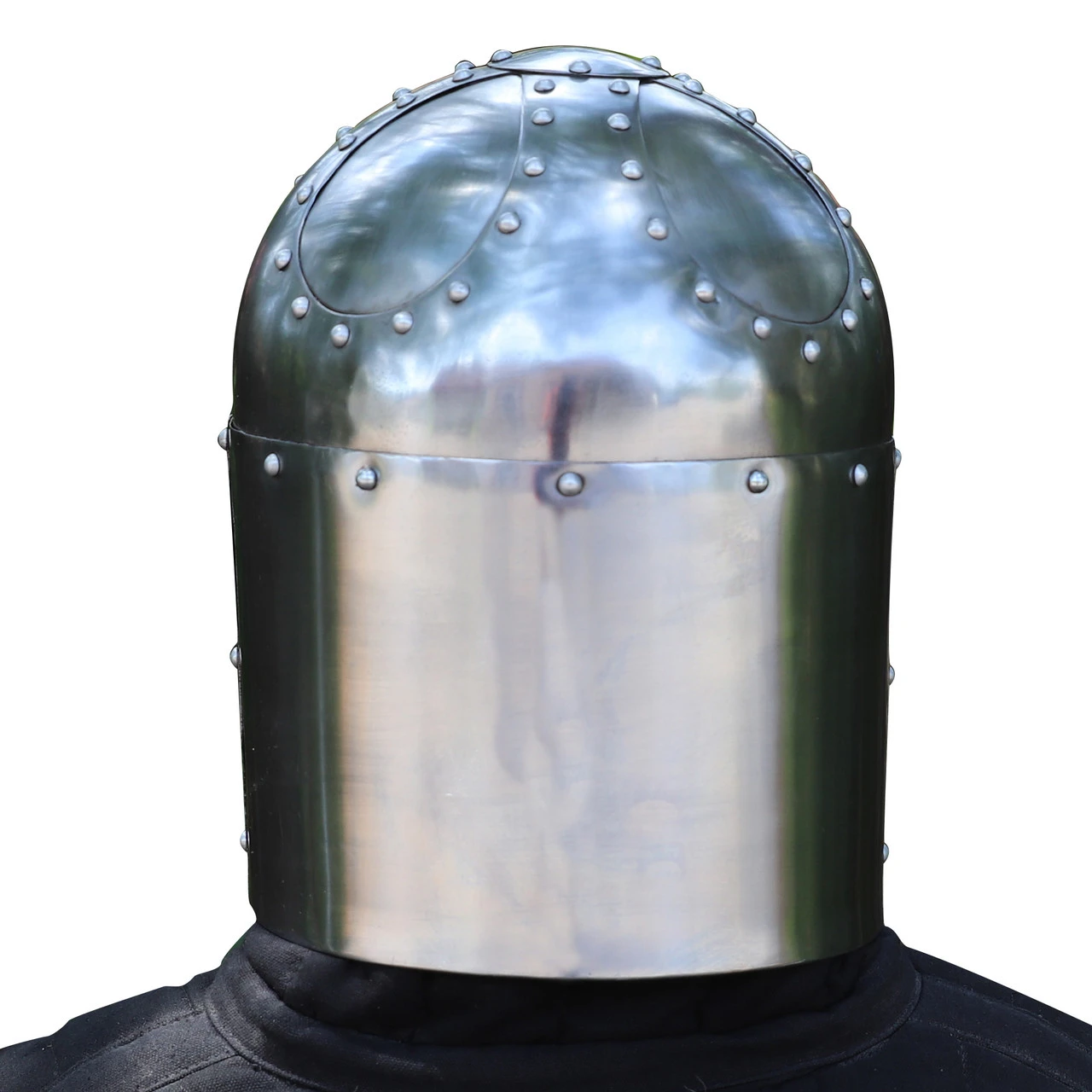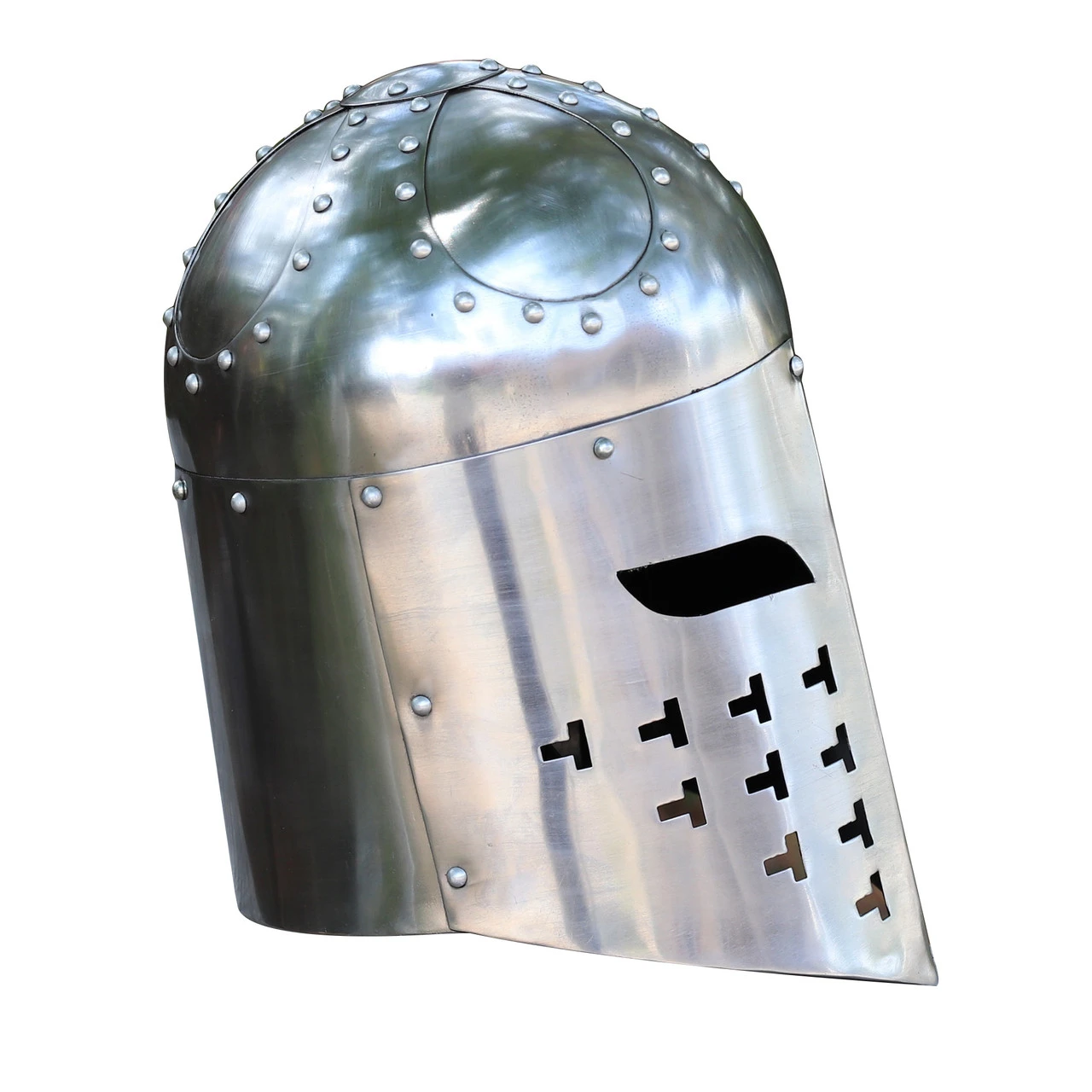 Our Fully Functional Sugarloaf Steel Helmet is one of the finer and exquisite of helmets on the market. Made of 16g steel with a lightweight construction, full face mask, and a soft interior leather liner this helmet is memorable five times to one. Being made with a solid construction and an antiqued finish this helmet is perfect for training, re-enactments, or tournaments. The breathing cut outs in the face guard make it easy for warriors to stay cool during intense battles and the slender eye cutouts make it harder for arrows and archers to bring harm to any part of a warriors head. The Germans did not go wrong when considering this helmet and its complete design.