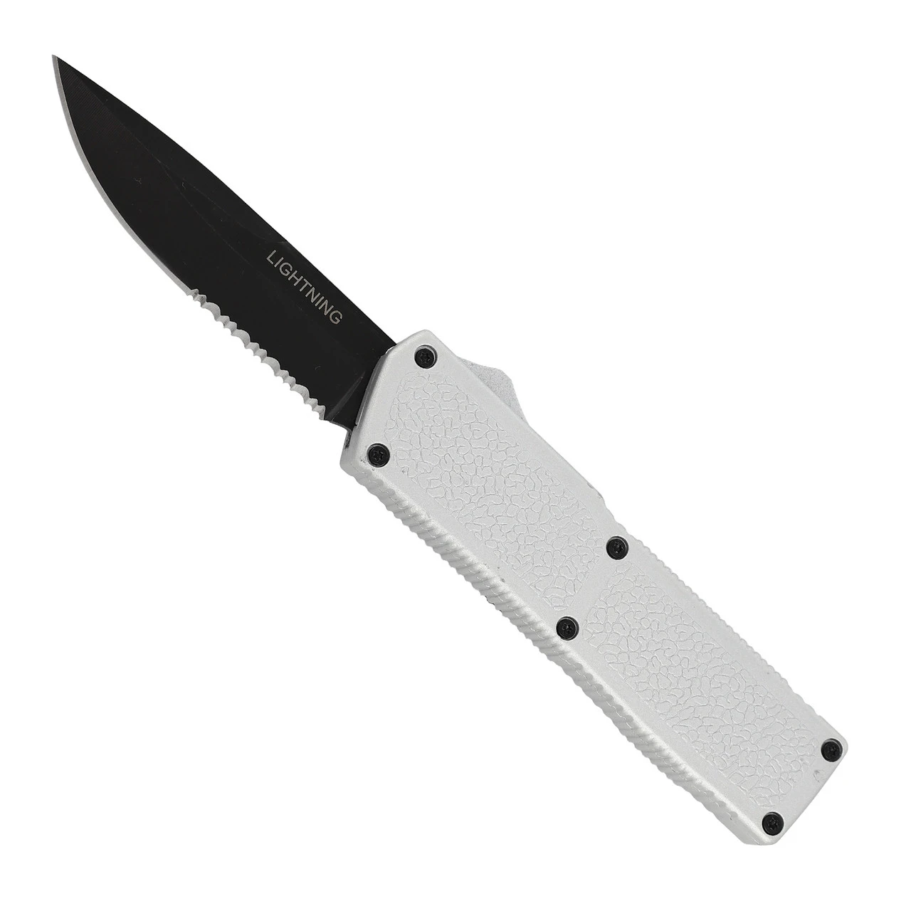 Do you need a knife that is quick on the draw and will not leave you hanging? Our LIGHTNING out the front automatic knives have you covered. This knife is dual action, meaning you can use the switch located on the side of the handle to deploy and retract the two-toned stainless-steel drop point blade at breakneck speed. Once you see it in action, youโll quickly realized why LIGHTNING is written on the blade! When not deployed, the blade is encased in the zinc allow handle that features a sleek silver finish with a textured pattern for outstanding grip. Six strong hex screws hold the handle together, and a anodized black pocket clip makes it to where you can carry your knife wherever you go. If you would prefer your knife stay concealed but still convenient to carry, weโve also provided a free black sheath with snap closure.