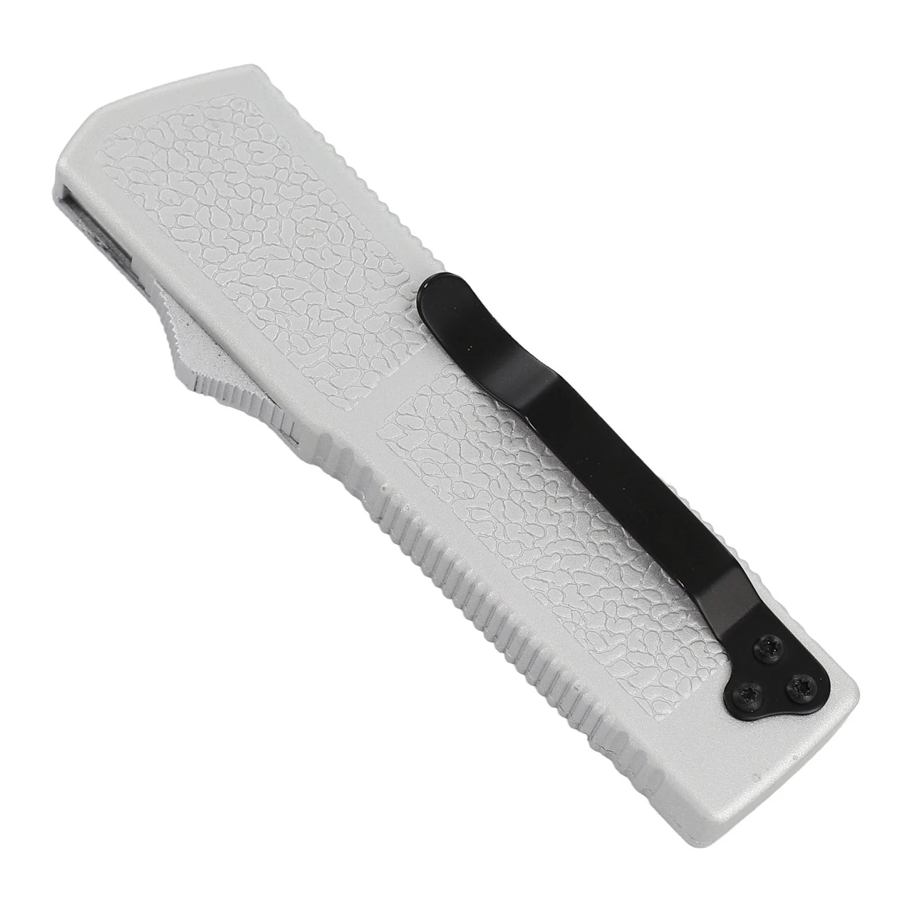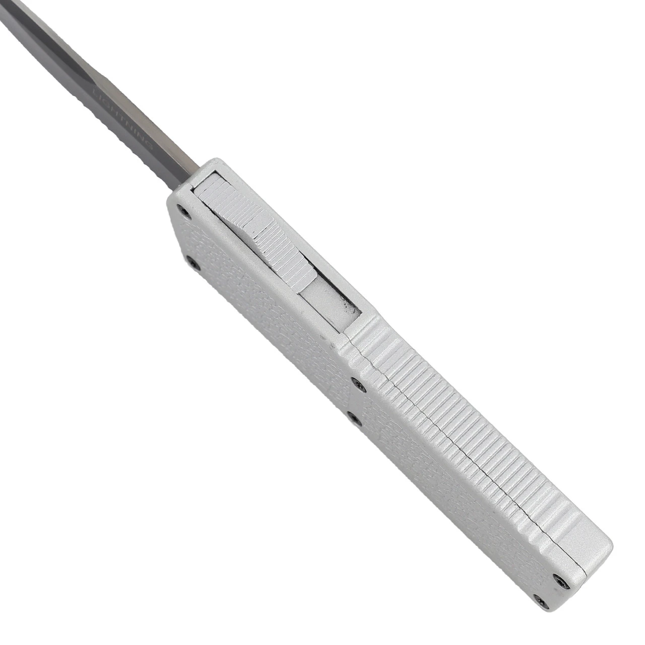 Features:Heavy DutyAutomaticDual ActionOut the FrontBlade Material: Stainless SteelDrop Point StylePartial SerrationAnodized Black FinishHandle Material: Zinc Alloy; SilverTextured GripBlack Pocket Clip/HardwareFiring Button Specifications:Overall Length: 7.85 InchesBlade Length: 3.25 InchesHandle Length: 4.55 Inches