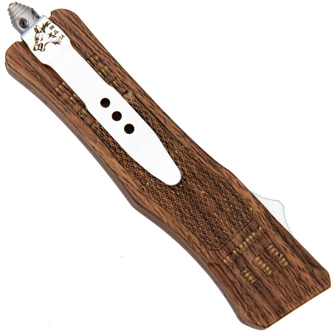 Rustic design is an art intended to pay homage to the beauty of simple nature while maintaining the itemโs identity. The Gleaming Woodland OTF is an automatic out the front knife with an endearing wood design on the handle which is also textured for firm grip. The blade is composed of Damascus steel which is a combination of 1095 high carbon steel and 15N20 creating a unique and gorgeous pattern in the blade. Four cutouts are featured in the blade along the fuller for elevated design and weight reduction and distribution. The textured switch for deploying the blade is on the side of the handle for easy one-handed blade deployment. Securely fastened to the base of the handle is a pocket clip. The Gleaming Woodland OTF also comes with a complementary nylon sheath with a belt loop for easy carry. Overall Length: 7 Inches. Weight: 0.45 lbs.