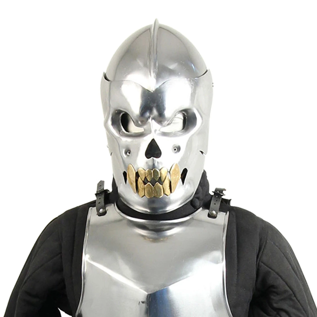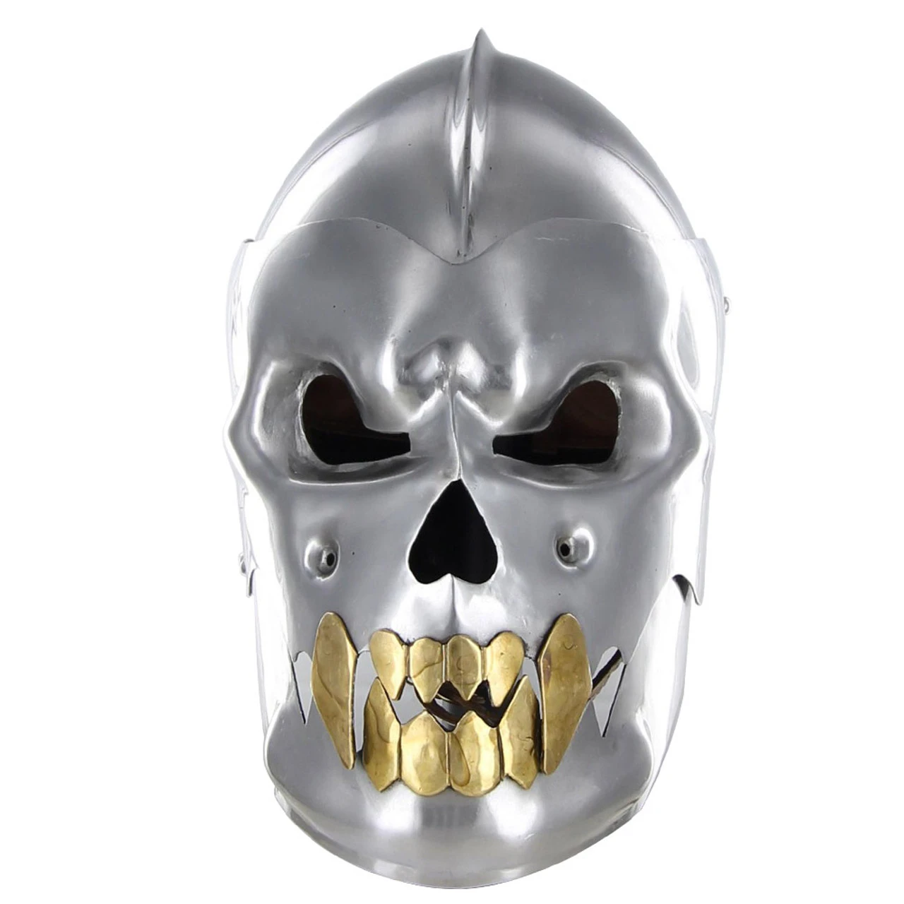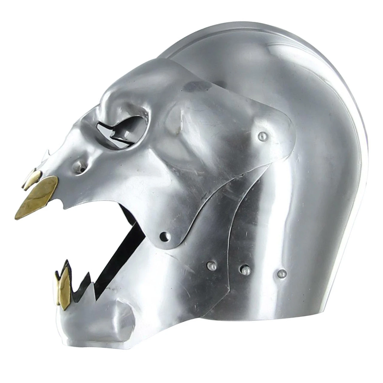 This helmet is made from steel and hand polished. It features brass dog like teeth for a malevolent effect. This entire piece was hand forged. On the side there is a lock and release for the movable face mask. The inside features a leather suspension liner to adjust to your size with a brass buckle. This demonic helmet is just terrifying to look at. It will intimate your opponent without you having to do anything but stand there. Overall Height: Approximately 11 Inches.