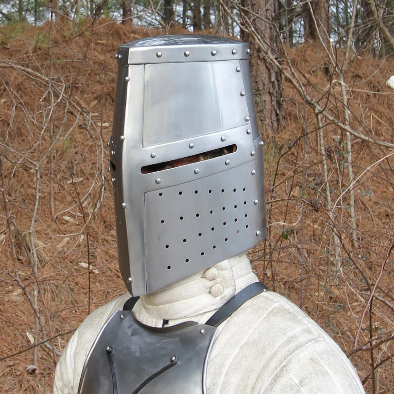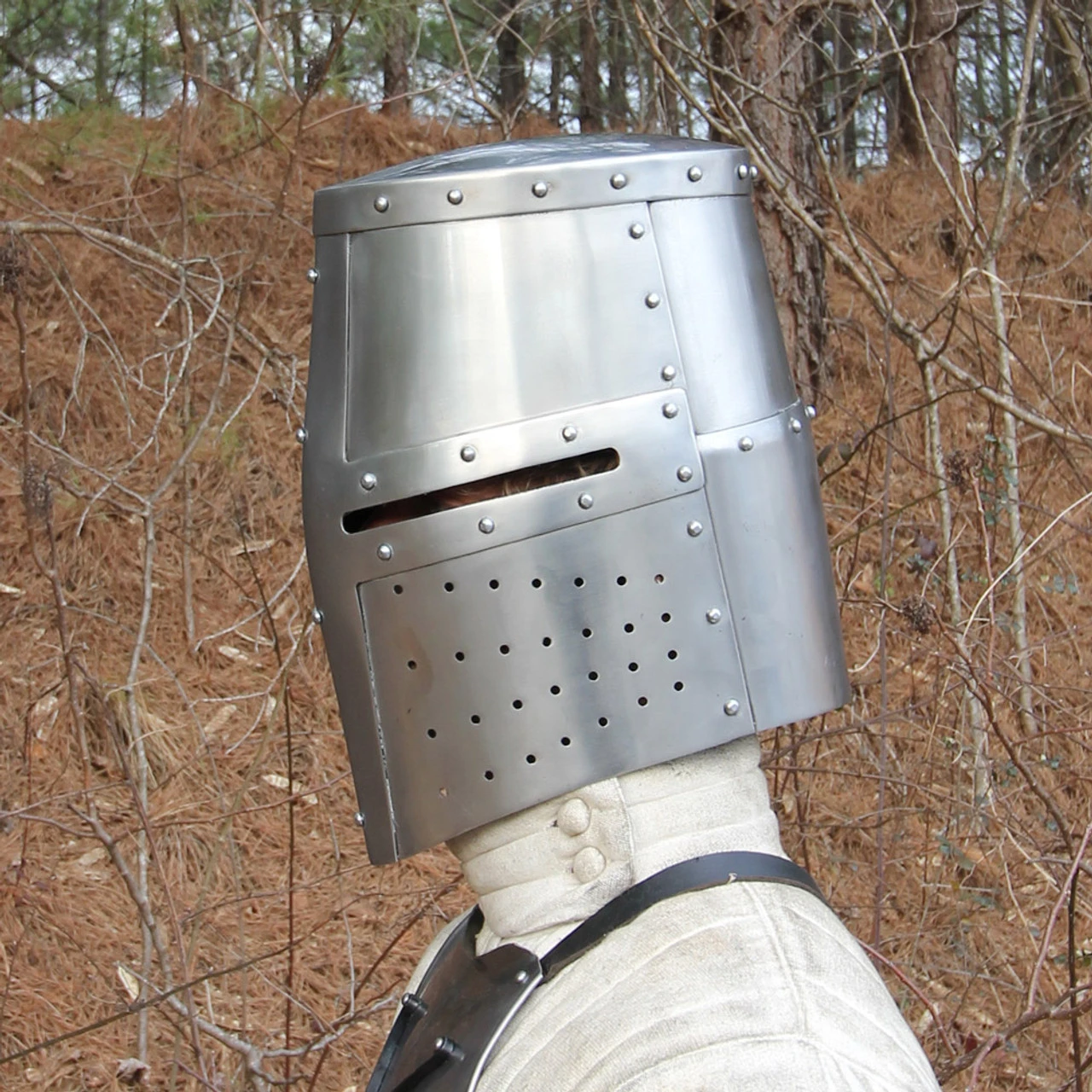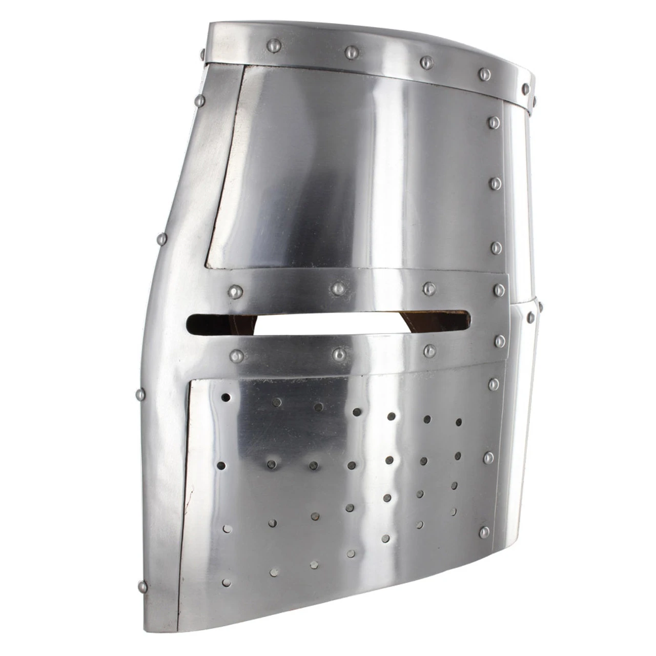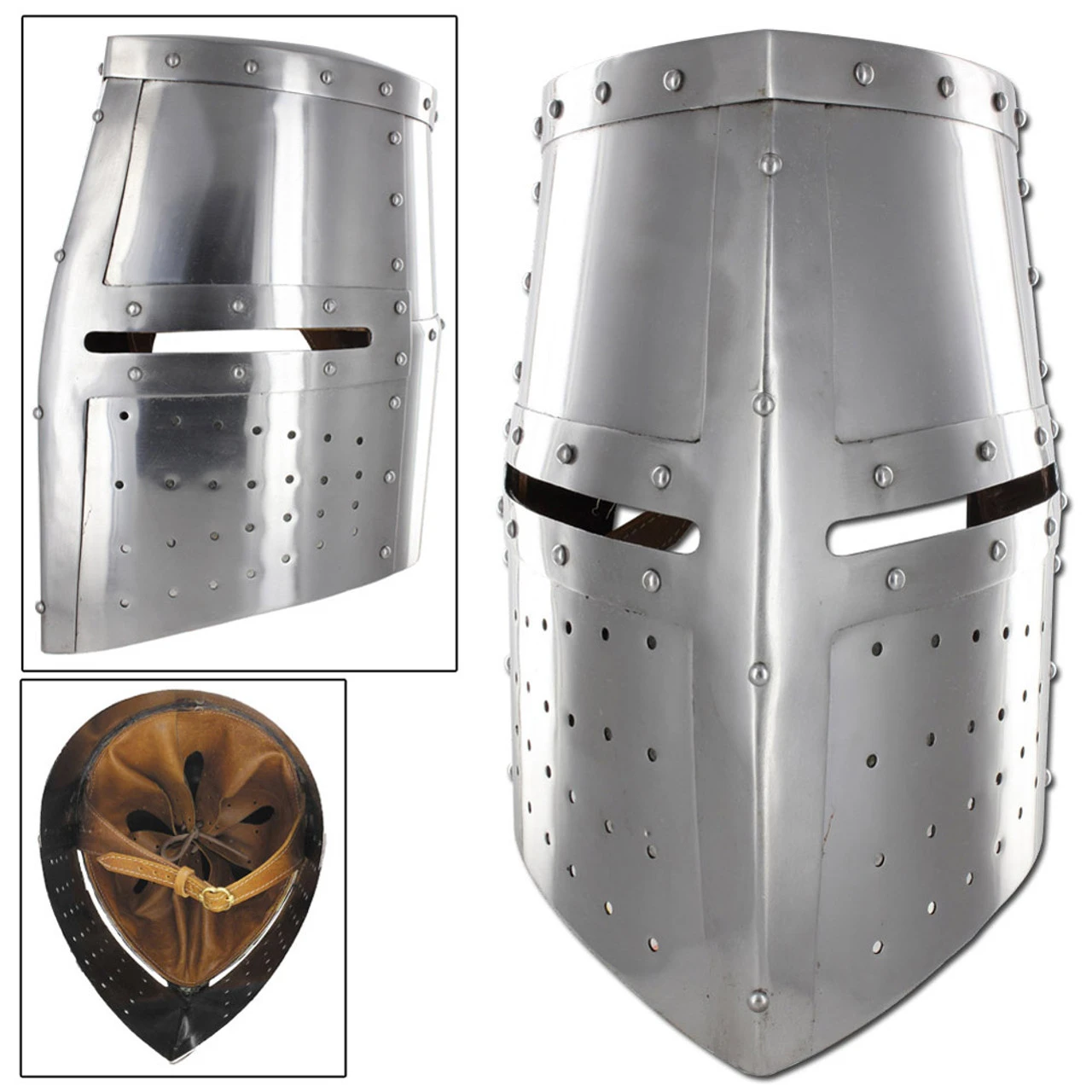 This helmet is constructed of hand-forged 18 gauge mild steel with an interior leather lining with chin straps and a brass buckle. This helm has menacing narrow eye slits and a ventilated face guard for maximum protection. Each piece has been riveted to the frame of this helmet making it a durable and solid piece. Overall length is approximately 13.5 Inches.