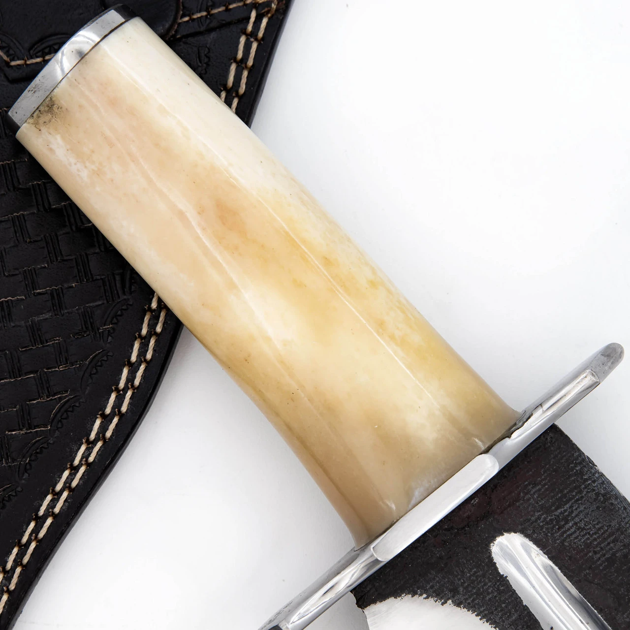 You looking for a knife? Well this, THIS is a knife! This large and in charge bowie style hunting knife is meticulously forged by hand from a solid piece of high carbon steel and features a standard sharpening. The edge of the blade has been polished to a reflective finish, and the cheek leading to the handle has been left a natural textured finish to reduce glare and add detail. A fuller has been carved into both side of the blade for weight reduction. Thatโs right, this knife may be massive but it is a nice weight and will fit comfortably in your hand. The smooth 4.75-inch handle is carved from real camel bone and topped with a steel pommel. A steel guard separates the blade and handle to prevent slipping. Included with this colossal knife is a hand-tooled sheath made from genuine cowhide leather that is stained ebony and features a stylish basket weave design. The simplicity of this knife makes it look as though it came straight from the great frontier, and you wonโt be disappointed adding this piece to your collection. Overall Length: 16.5 Inches, Blade Length: 11.25 Inches
