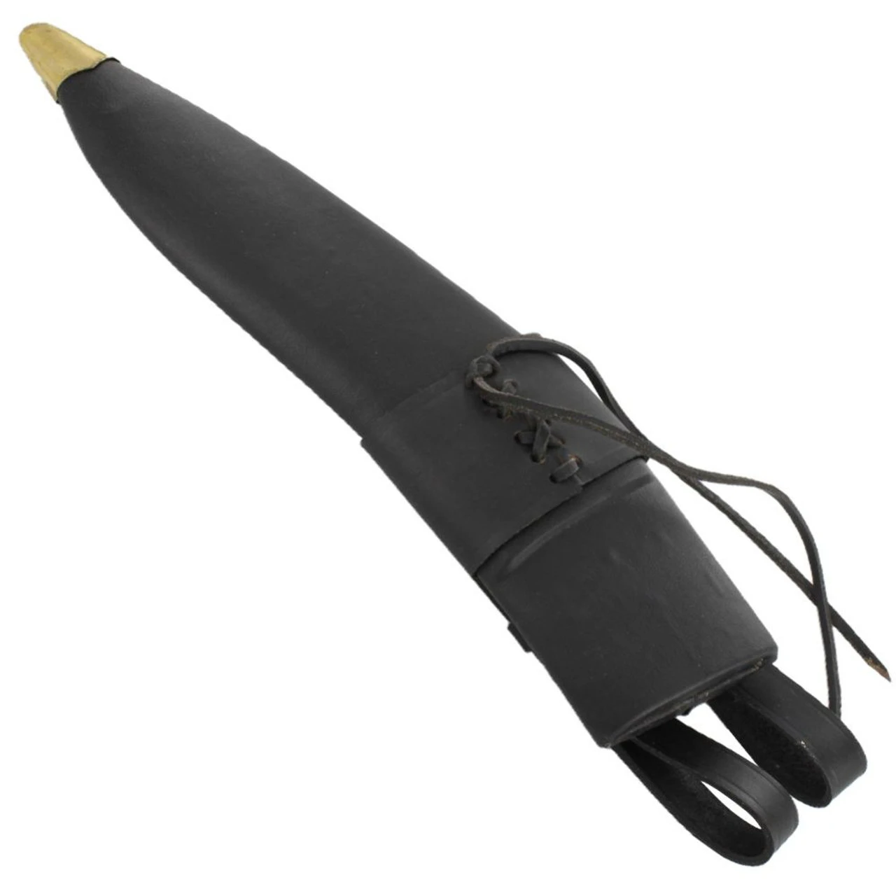 The Gurkha Soldier Jungle Steel Kukri has a thickness of 5mm and comes unsharpened for reenactments, but can be professionally honed. Hardwood is shaped into a scabbard that is wrapped in leather and stitched from top to bottom. At the base is a shiny brass fitting that looks outstanding on the black leather. The frog is made of genuine cow hide leather and is fully sized and featured with adjustments and two loops. Overall length is 17.50 inches.