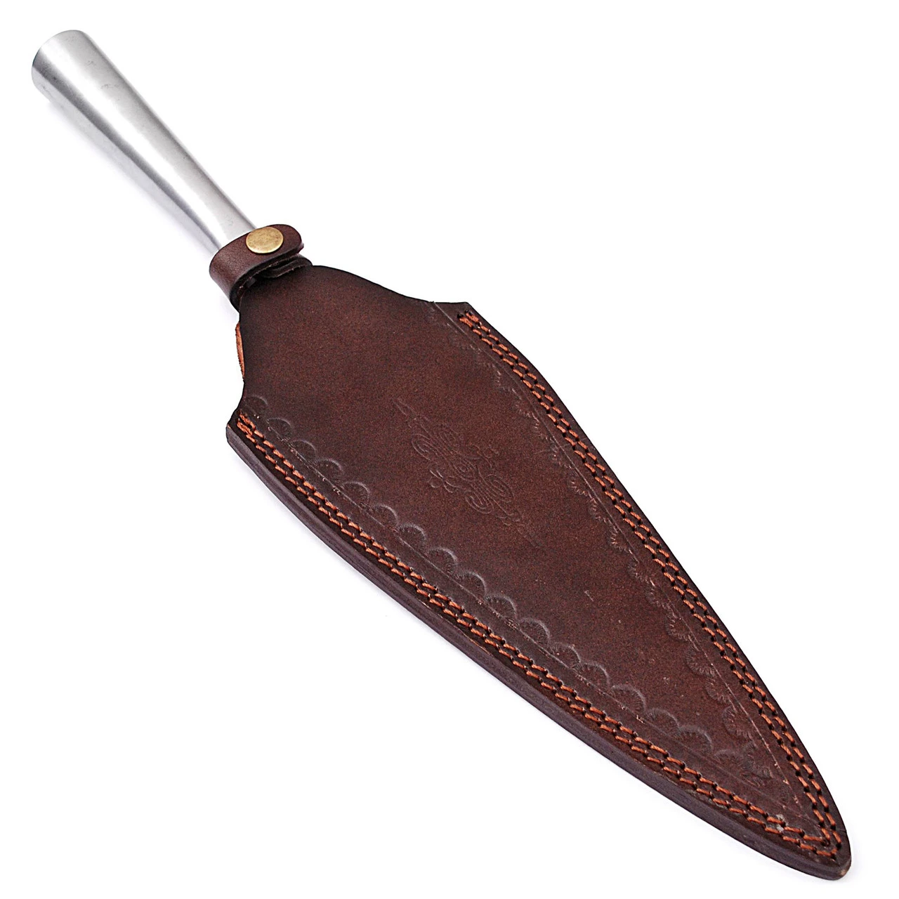 This elegant spear head is made from high carbon steel, and features ornate designs and a fascinating shape. The shape resembles that of a spear that may be used by elves in a fantasy game or movie. This spear would be perfect for a fantasy costume or cosplay. Included with this beautiful spear head is a hand tooled genuine leather sheath with a snap closure. Overall Length: 18.0625 inches