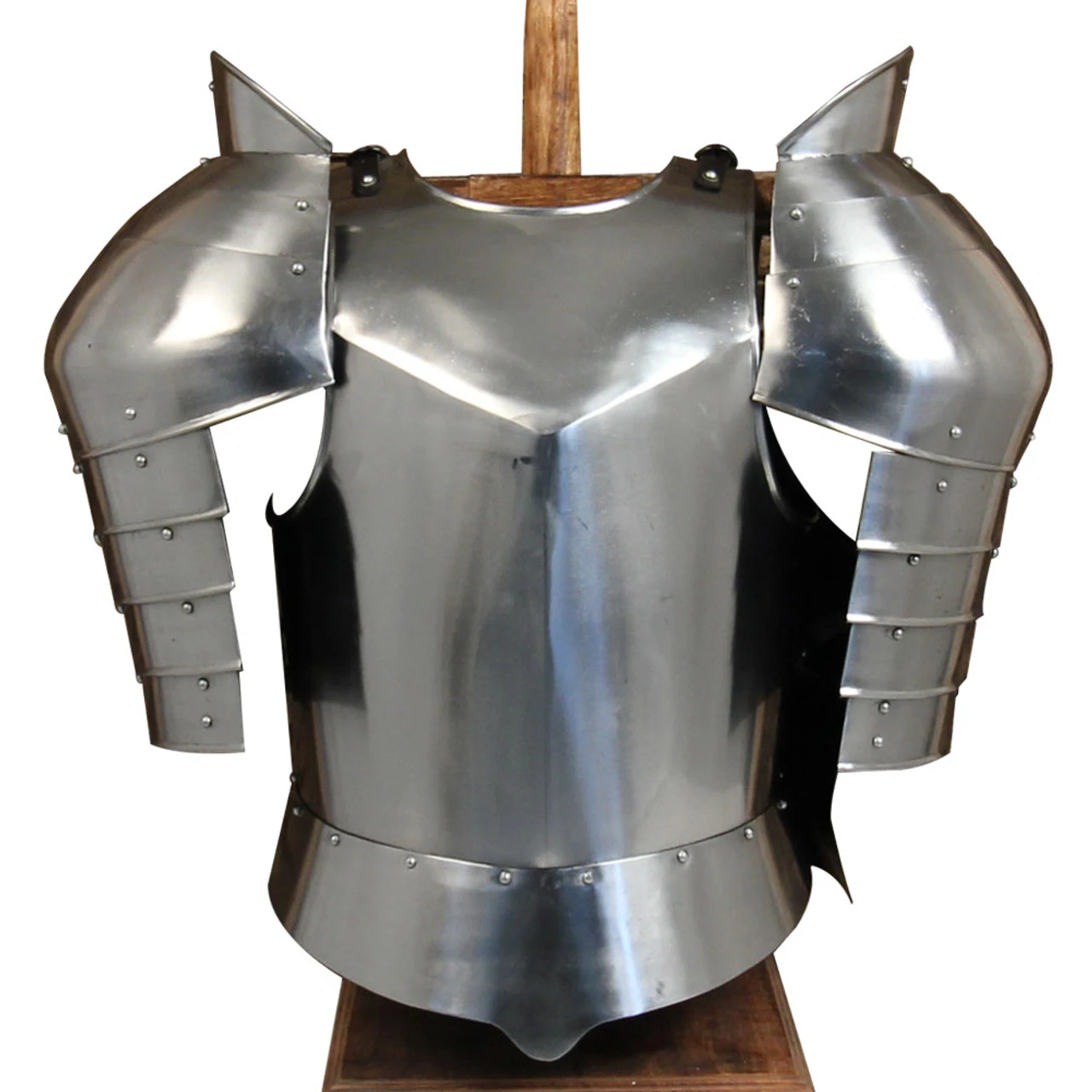 The body armor here consists of a cuirass with a set of pauldrons. A cuirass is a piece of armor formed of a single or multiple pieces of metal or other rigid material, which covers the front of the wearer’s torso. This cuirass comes with a detachable back piece to complete torso protecting armor. The pauldrons cover the armpit, shoulder, upper arm, and sometimes parts of the back and chest. A pauldron typically consists of a single large dome-shaped piece to cover the shoulder (the “cop”) with multiple lames attached to it to defend the arm and upper shoulder. This set comes polished with four riveted lames. This set if perfect for costumes and re-enactments.Cuirass Overall Length: 19 Inches.