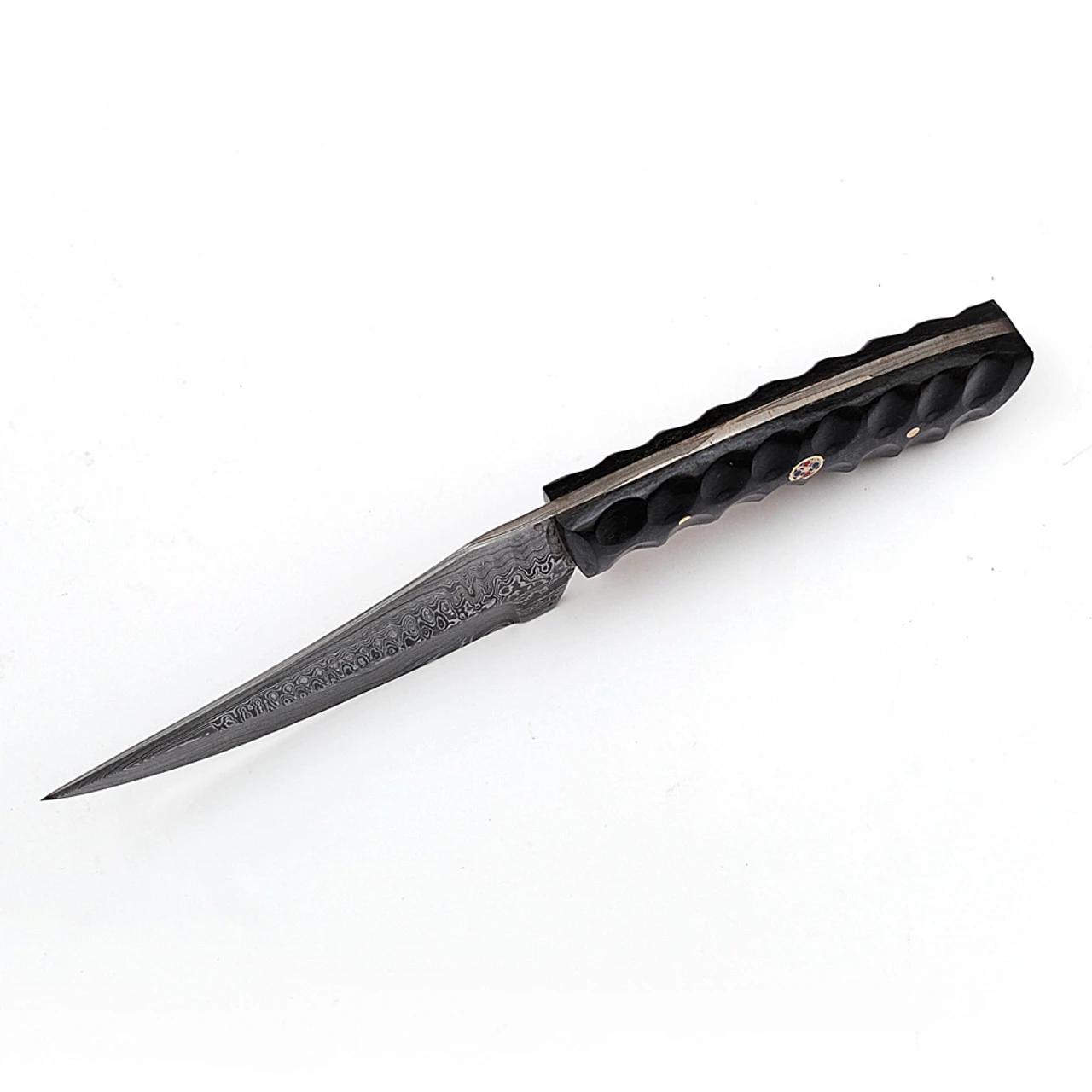 This custom made skinner is made from Damascus steel in a random pattern with a clip point blade. Clip point blades are great for skinning game as the up-turned tip gives a precise cutting edge. The blade comes with 280 layers and a HRC rating of 58 to 60. The Damascus has been forged from 1095/15N20 steel. The handle is made from all natural bone with a divot design that has been hand polished. A mosaic and brass pins hold the mounts together. A lovely genuine t leather sheath is included. It has been hand sewn, tooled, and stained. The sheath has two slots for your belt. With a full tang construction this skinner is the perfect hunting knife.Overall Length: 9 Inches.