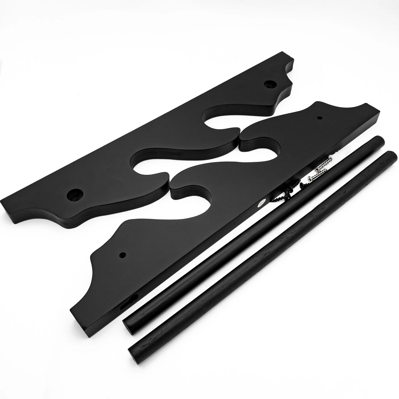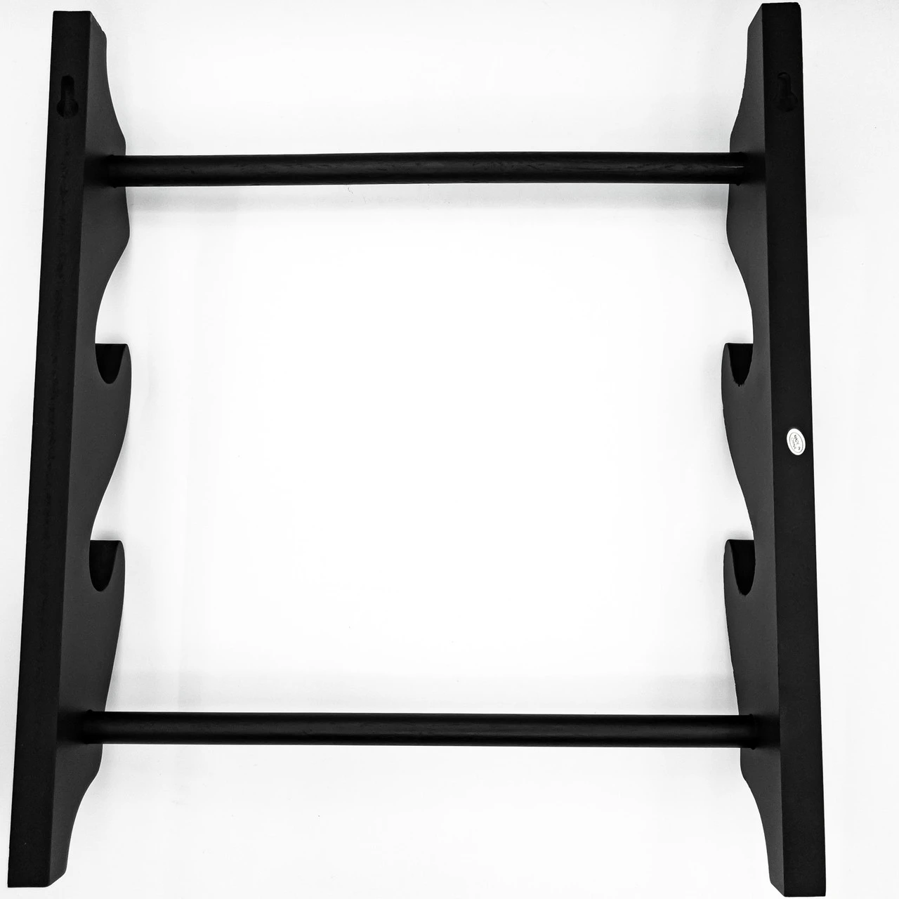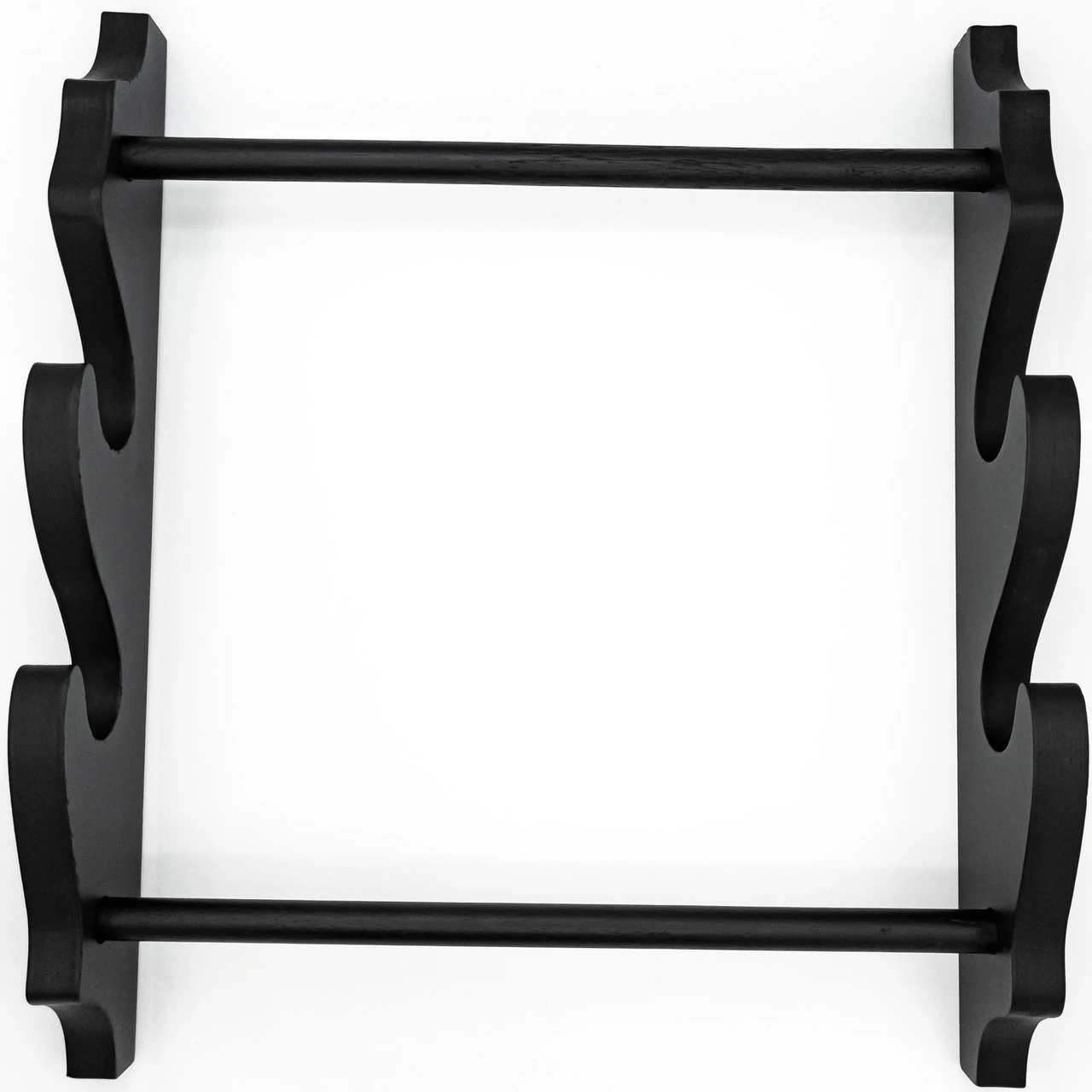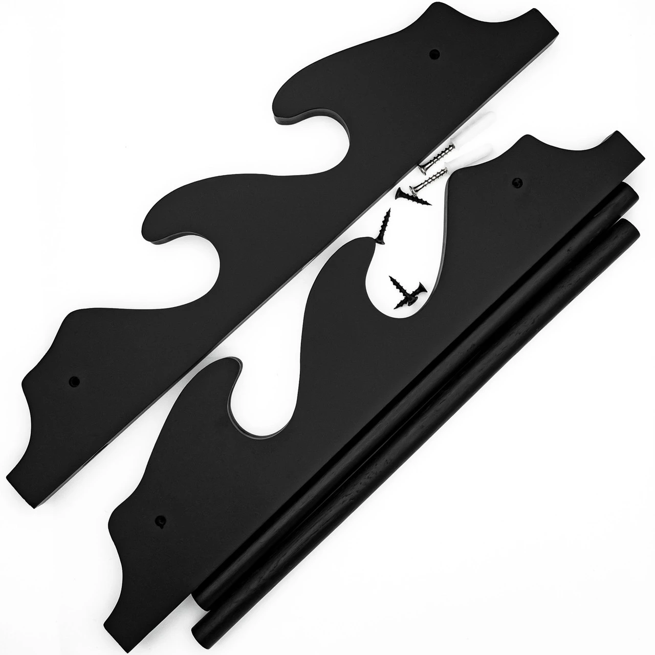 The Hanging Throne Wall Mounted Dual Sword Stand is an elegant, jet black wall mounted sword stand. The stand consists of 4 pieces of wood: 2 for the sides to hold the swords and 2 horizontal cylindrical pieces to hold the side pieces together. The stand would be fixed to the wall via the included wall mounts and the holes on the top of either side piece in the back. Two wall anchors and 4 screws are included; the wall anchors are to fix the stand to the wall and the screws are to fasten the cylindrical pieces to the side pieces. The stand is simple and elegant so as not to take attention away from the swords it holds. The swords are king and this hanging wall stand is their sound, reliable throne. Stand Height: 15.75 In. Weight: 0.7 lbs.