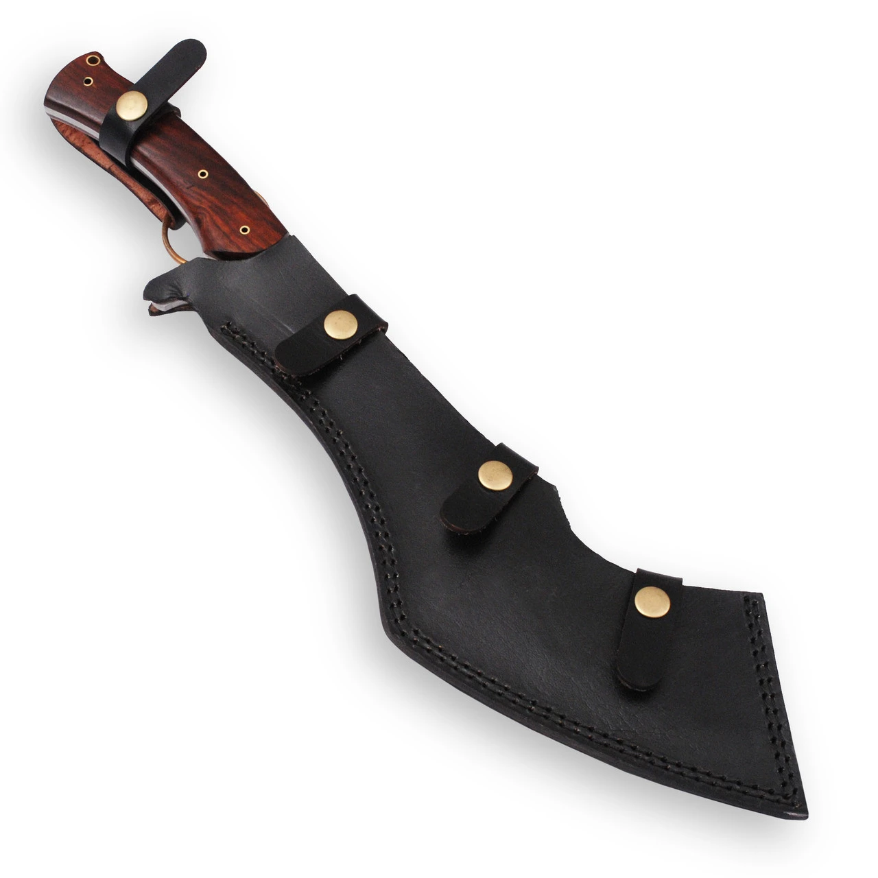 This wicked machete features a unique design that is perfect for all of your outdoor needs. The high-quality steel blade has a unique shape that can serve multiple purposes. Use the curved belly of the blade for cutting, and the upward part of the blade edge for chopping. The full tang is visibly sandwiched between two pieces of smooth rosewood slabs for an excellent grip. A lanyard hole at the end of the handle allows you to attach a cord or rope. Included with this badass machete is a hand tooled leather sheath for easy carry. Overall Length: 18 inches, Blade Length: 12.75 inches