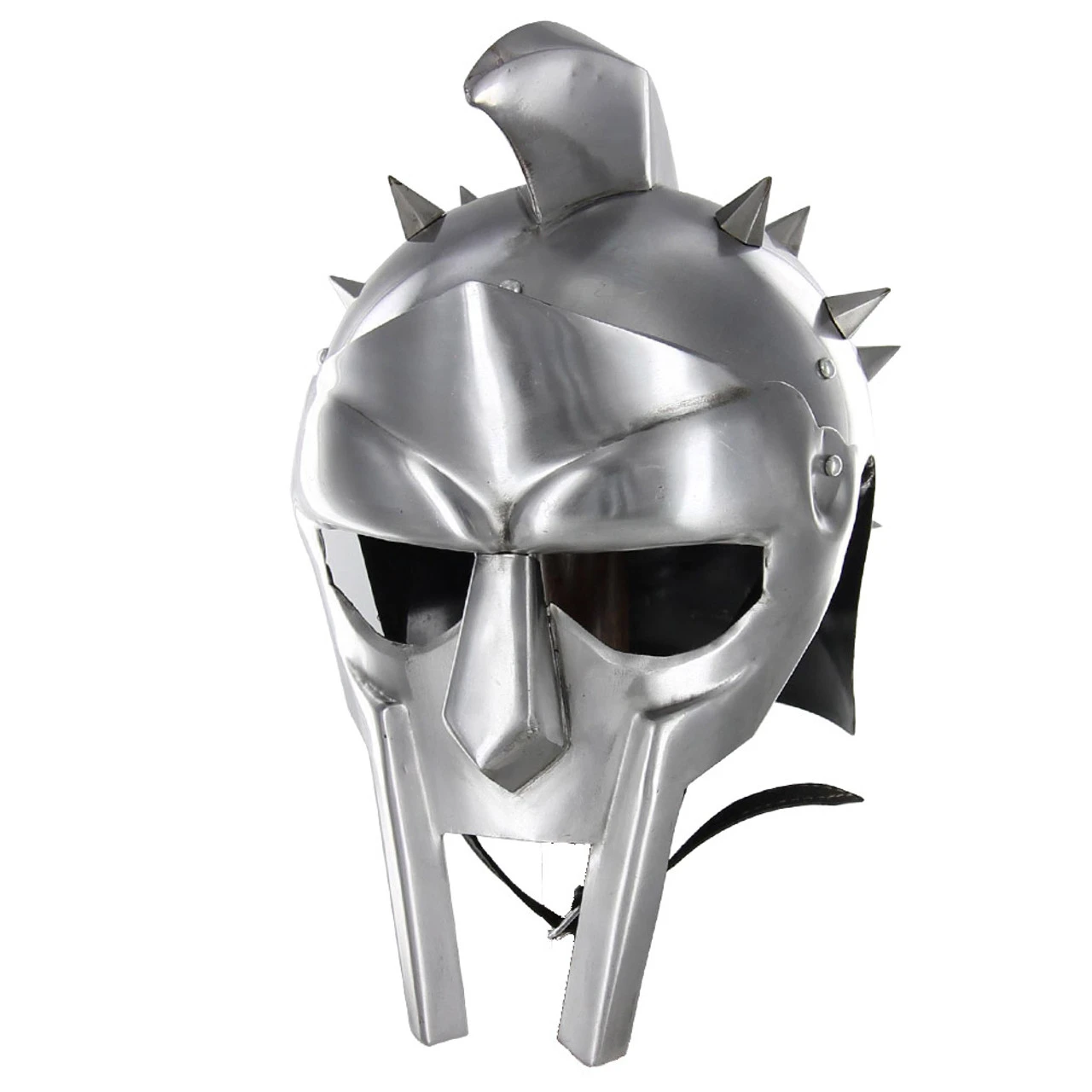 From the Gladiator movie comes this functional replica Helmet of the Spaniard. The steel is thick and hard for absolute armor protection. At the top is a contoured crest, welded on, diverting any strikes from the top. The front spikes out and adds the intimidating factor needed in an arena. 20 Steel Spikes are fixed all across the rounded helmet.