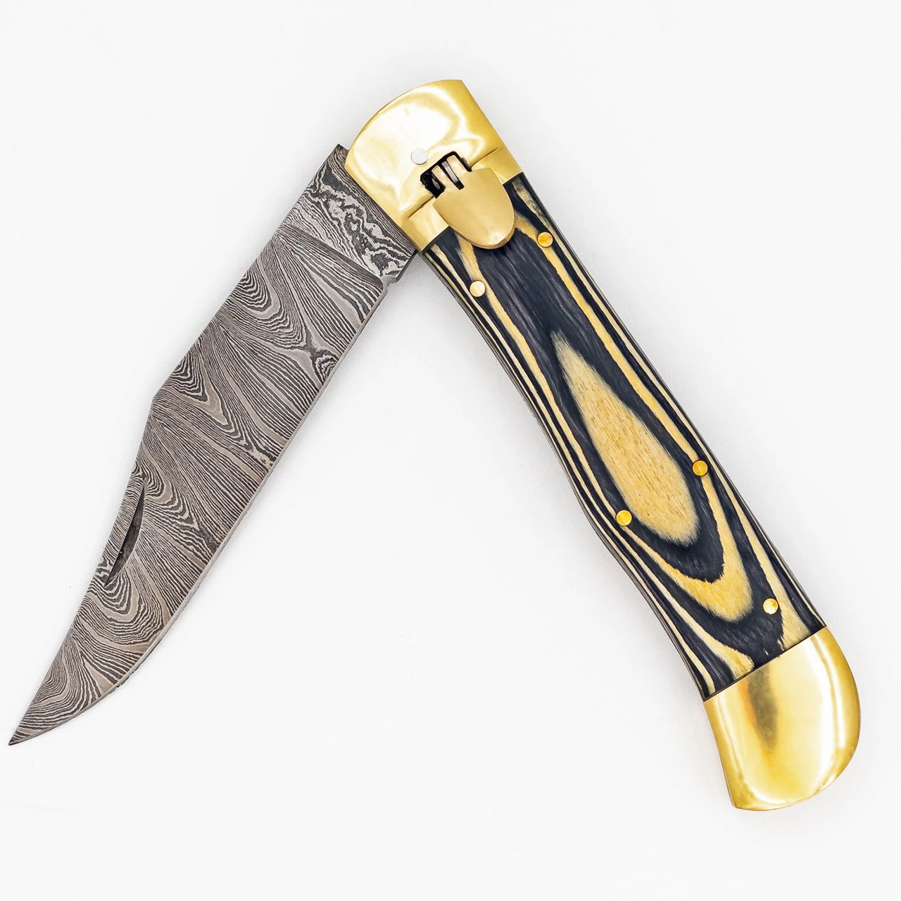 The Hive Mind XL Automatic Switchblade is an automatic switchblade with a lever lock affixed to the guard for deployment of the blade as well as to keep the blade from deploying when not in use. The grips are wood that has been dyed a striated yellow and black. The frame holding the grips is steel and the hardware as well as both bolsters are pure brass which compliments the dual-colored grips beautifully. The lever on this automatic switchblade is brass, too. If you press it down then the stunning Damascus steel blade will spring out from the left side of the handle and lock into the upright position. Simply press and hold the lever back down and you can guide the blade back into the handle. Flip the lever up and the blade cannot deploy. For even safer and easier carry you can then put the Hive Mind XL Lever Lock Switchblade in the complimentary genuine leather sheath that it comes with and take it on the go. Overall Length: 10.88 Inches. Weight: 0.75 lbs.