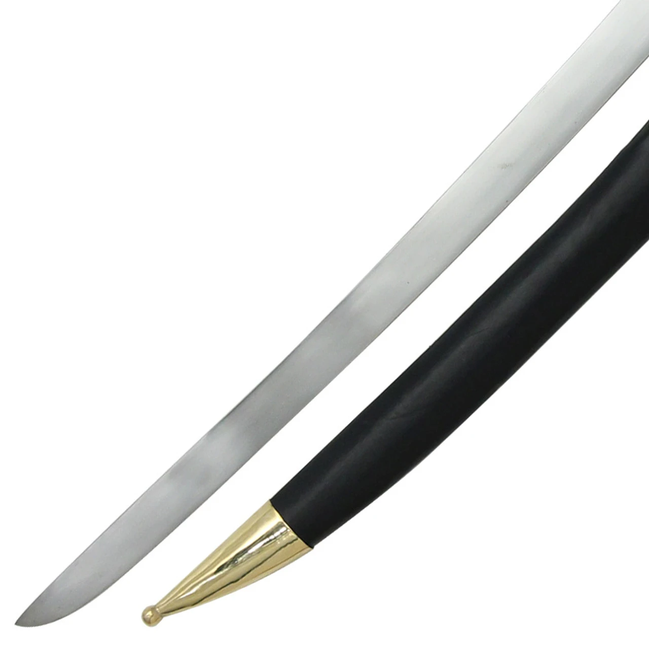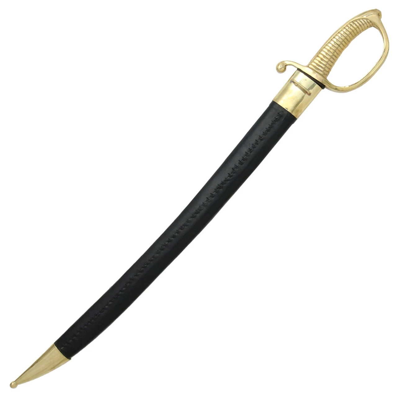 Sabres were commonly used by the British in the Napoleonic era for light cavalry and infantry officers, as well as others. The Briquet sabre was authorized by the British Government in 1803 for use by infantry officers during the wars against Napoleon. The Briquet here is constructed with a carbon steel blade in sabre style. The edge is dull which is perfect for re-enactments or the theater. The ribbed hilt is made from aluminum alloy with a golden finish that matches the aluminum tip and throat and the scabbard. The scabbard is wood that has been wrapped with leather and hand sewn.