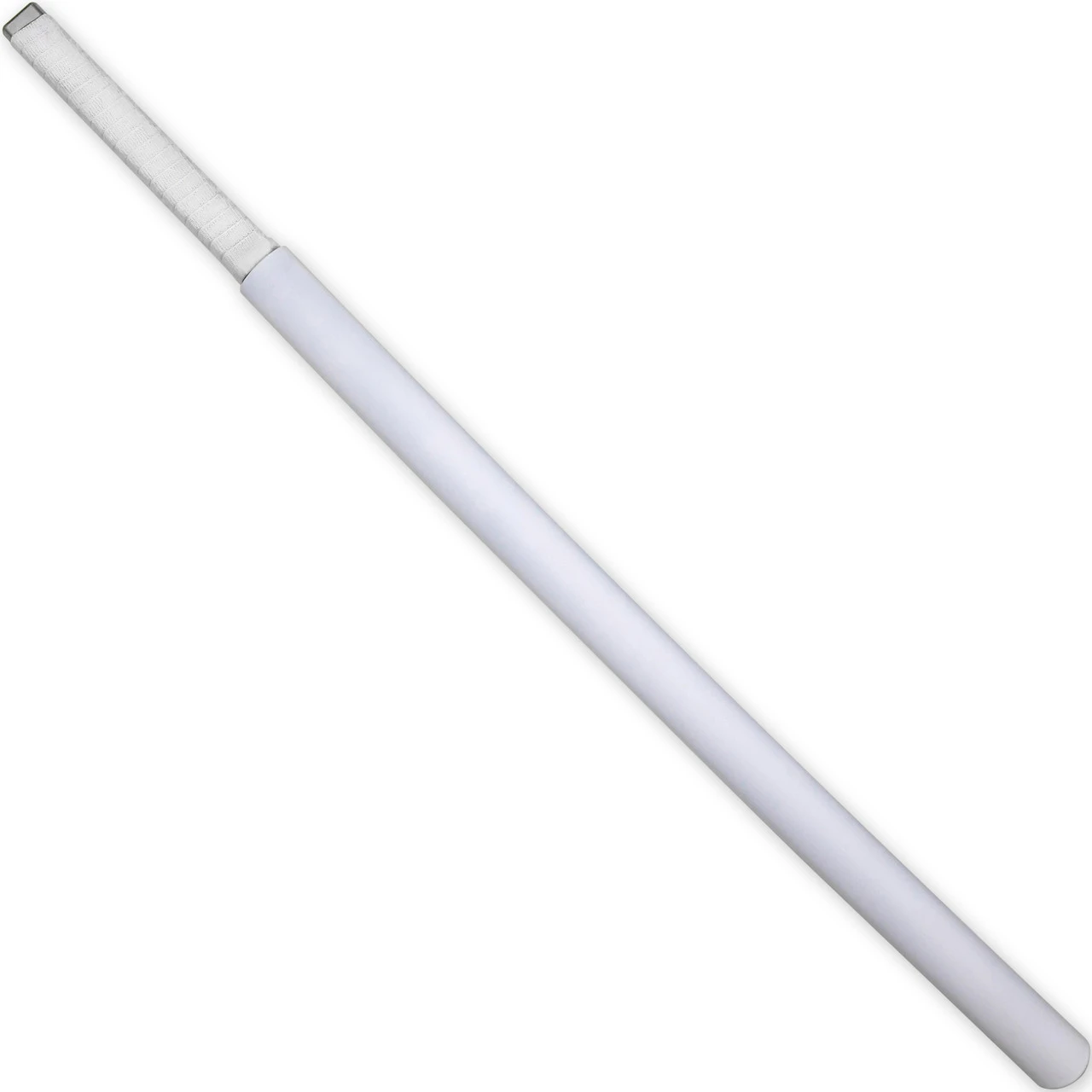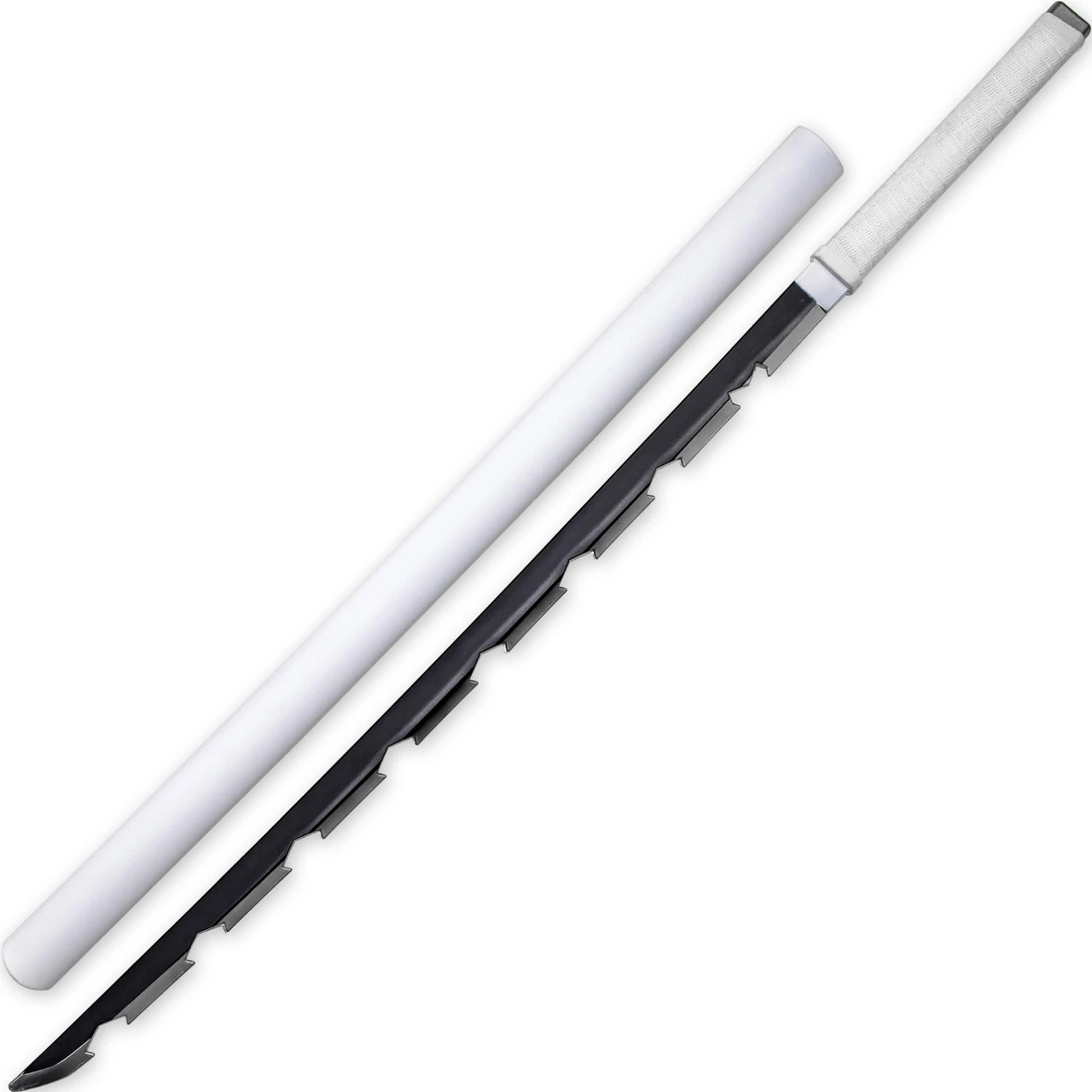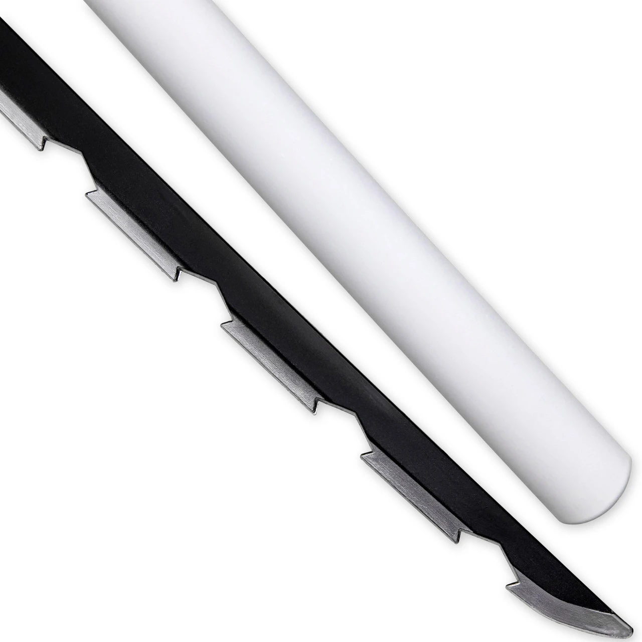 This full-size replica may be made of foam, but it is certainly no childrenโs toy. This modified Nichirin sword is composed of polyurethane foam and features a 10 mm fiberglass core. Polyurethane foam is both durable and flexible, and the added fiberglass core creates a strong sword that can be used for cosplay as well as kicking bad guy butt in mock battle. The base of the blade is a matte black and has a jagged edge with a silver Hamon. The handle is molded to resemble a cloth wrapping in white, and is topped by a painted silver pommel. Included with your purchase is solid matte white hard plastic scabbard to house your blades when not in use, though this will not be needed for the character since he does not use them. This lightweight prop is the perfect accessory to complete your cosplay and carry around your next convention. Overall Length: 39.5 inches, Blade Length: 29.5 inches